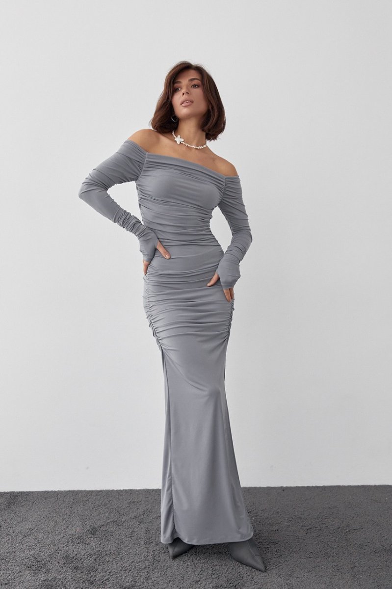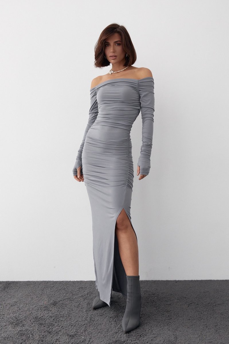 У моделі довжина максі та з лівого боку низ доповнений високим розрізом. Бічні шви основної частини виробу та рукава доповнені драпіруванням на резинці. Низ рукавів має розріз для великого пальчика. Верх сукня з відкритими плечима і доповнений короткою підкладкою з основної тканини.