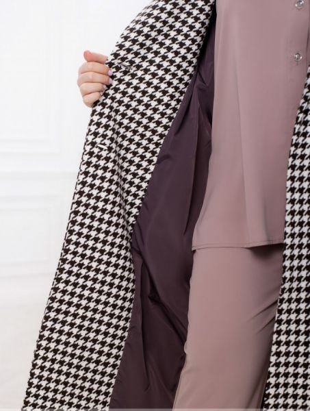 Пальто на підкладці доповнено довгими рукавами з приспущеною лінією плечей, відкладним коміром і зручними кишенями. Модель застібається на гудзики спереду.