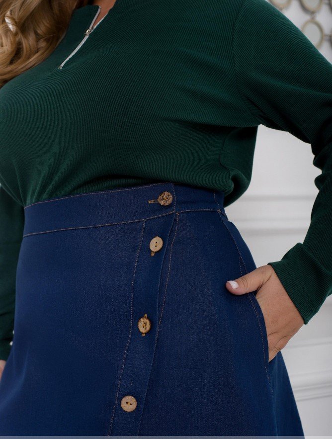 Жіночна джинсова спідниця міді стане вашим фаворитом в цьому сезоні завдяки комфорту і універсальності, які вона подарує вам. Модель на резинці, вшитій в пояс по спинці, застібається на ряд гудзиків спереду, а також доповнена зручними кишенями в бічних швах.