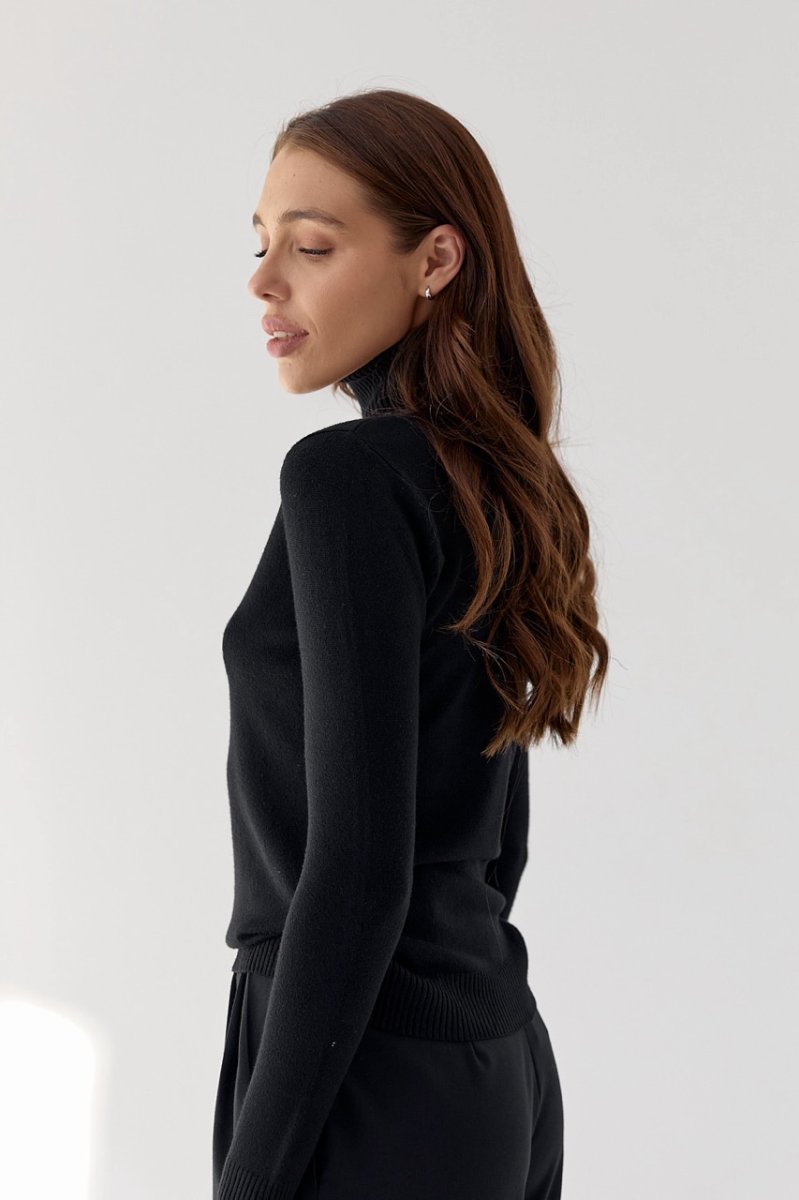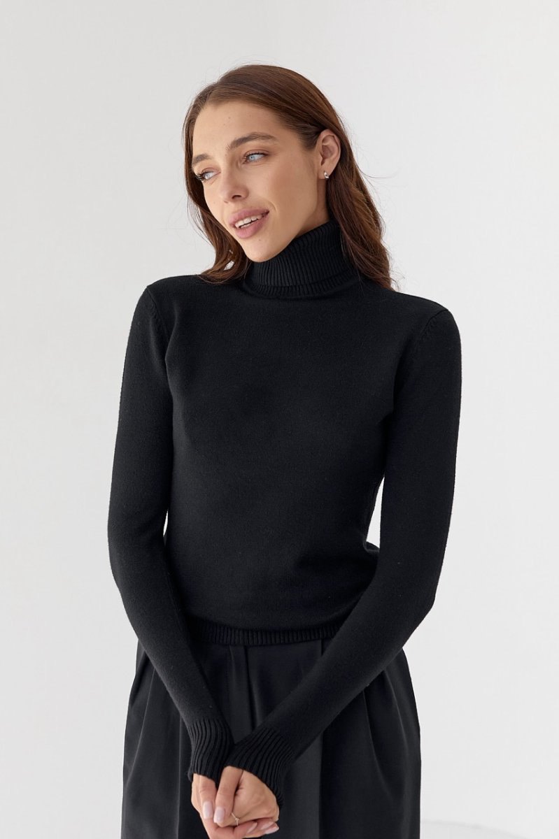 Трикотажний теплий гольф із круглою горловиною, висота коміру-стійки 15 см. Рукава втачні, довгі. По низу виробу і рукавів: манжет-резинка.