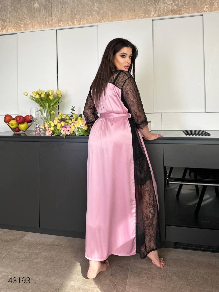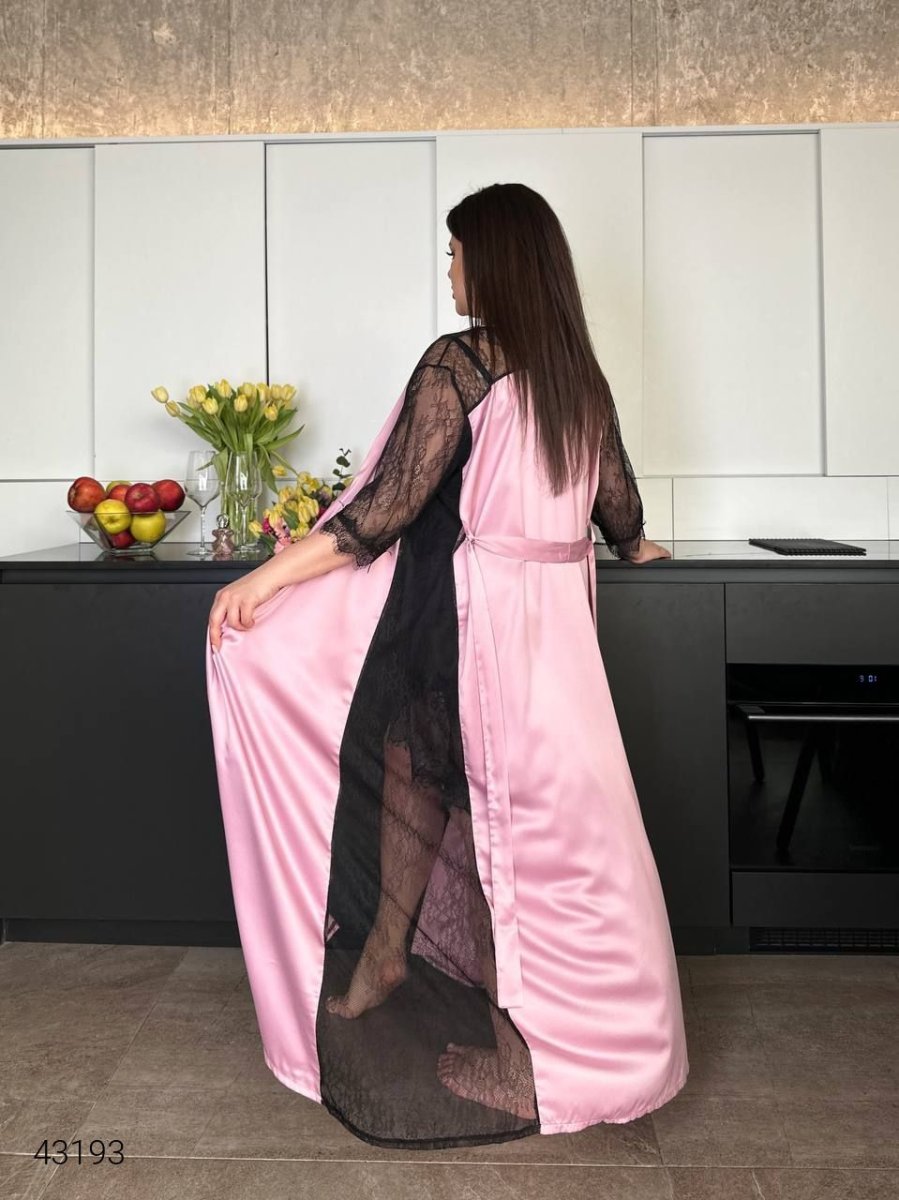 Халат жіночий шовковий з мереживом. Розширений по низу із вставками вздовж усього халата з боків. Мереживні рукави, пояс у комплекті. Тканина: армані шовк, не тягнеться. Склад: Поліестер - 95%, Бавовна - 5%.