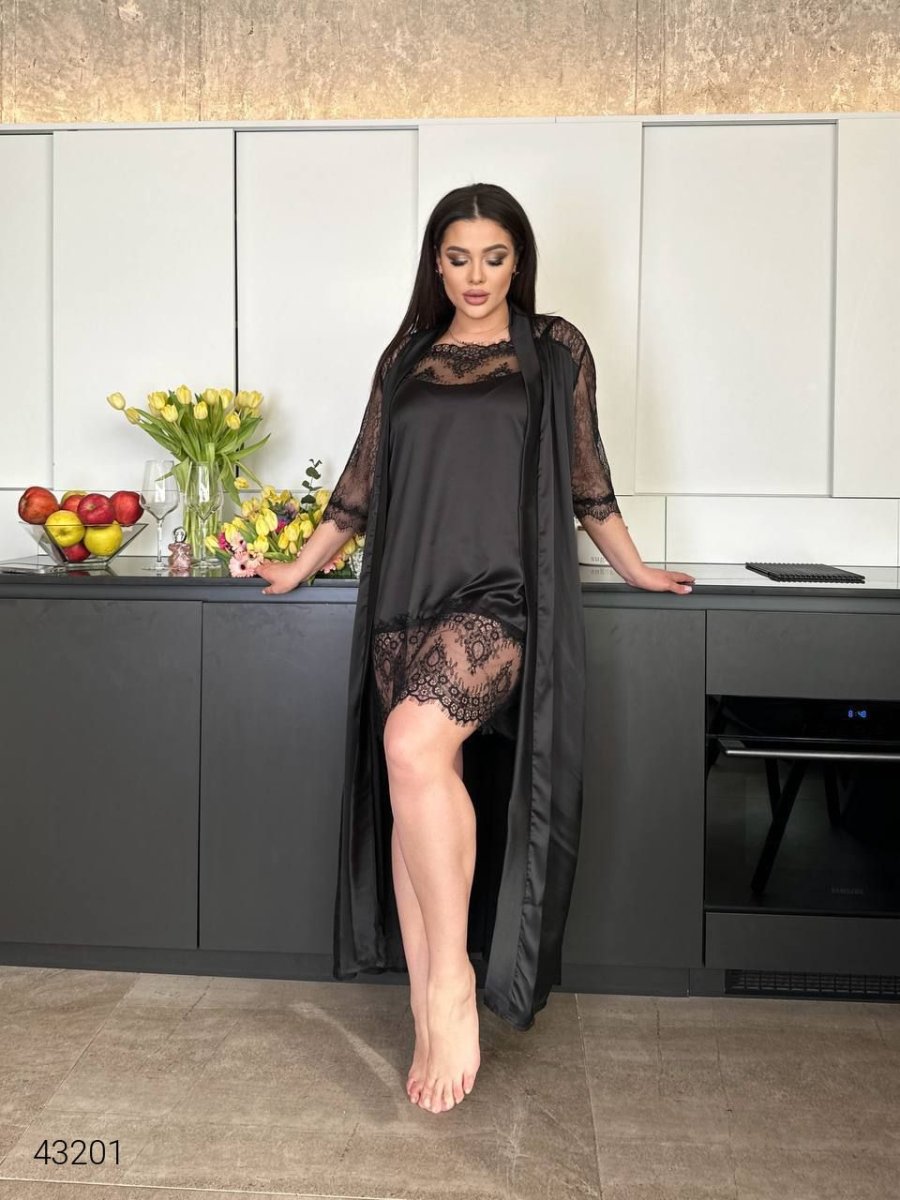 Халат жіночий шовковий з мереживом. Розширений по низу із вставками вздовж усього халата з боків. Мереживні рукави, пояс у комплекті. Тканина: армані шовк, не тягнеться. Склад: Поліестер - 95%, Бавовна - 5%.