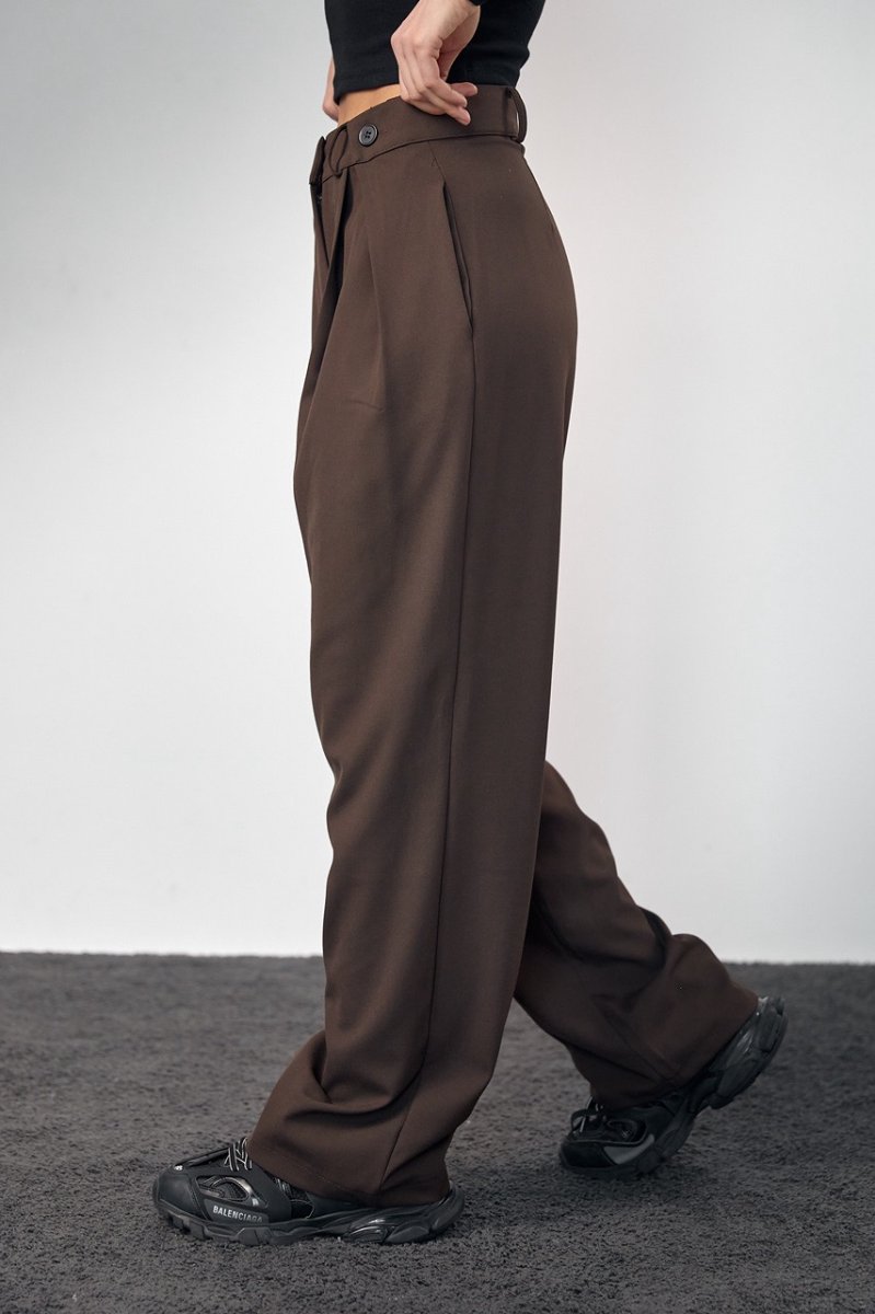 У цій моделі краї низу прямі, а втачний пояс йде без резинки та з петлями для ременя. Застібається виріб на два потаємні гудзики та на блискавку. Також на поясі пришиті два декоративні гудзики, які фіксують бічний нахльост і таким чином формує складку. Ззаду угорі є вертикальні виточки. Для більшого комфорту штани мають прорізні кишені.
