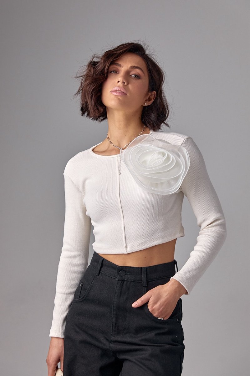 Короткий джемпер у рубчик з об'ємною квіткою - 12380 кремовий