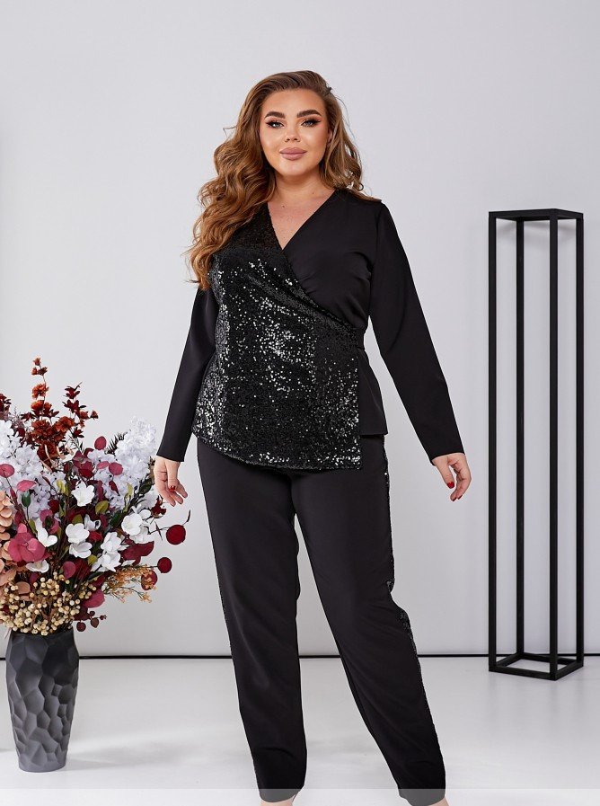 Ошатний класичний костюм із пайетками - це елегантний та стильний вибір для особливих випадків. Цей костюм стане окрасою вашого гардеробу та ідеальним вибором для важливих подій чи святкових вечорів. Костюм складається із жакета на запах, який додає вишуканості образу.