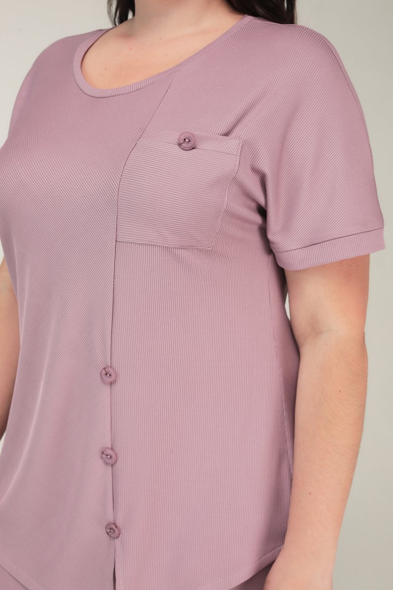 Костюм двопредметний із тканини трикотаж рубчик. Тканина літня, має рефлену, чітко виражену структуру. Матеріал еластичний, гарно лягає по фігурі. Брюки прямі на резинці. Футболка прямого силуету, рукав цільнокроєний на манжеті. Полиця асиметрична з вертикальним швом і знизу з розрізом. По центру виконано горизонтальну краплю, зліва на грудях - накладна кишеня. Ґудзики по всьому виробу – декоративні.