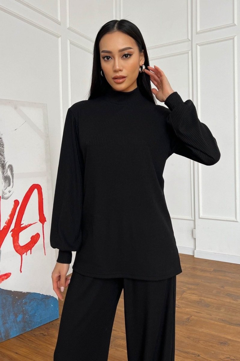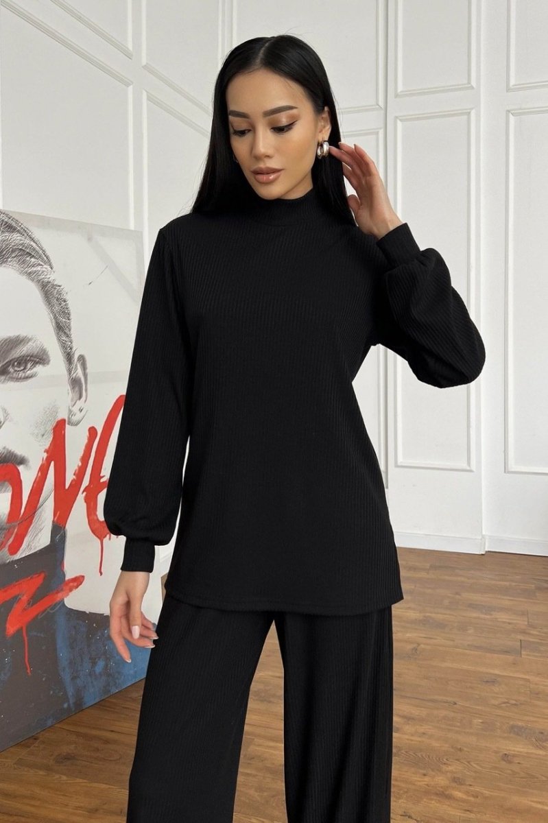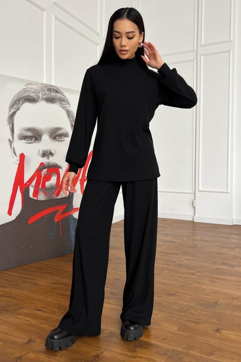 Модель крою oversize з тунікою та широкими брюками з високою посадкою на талії.