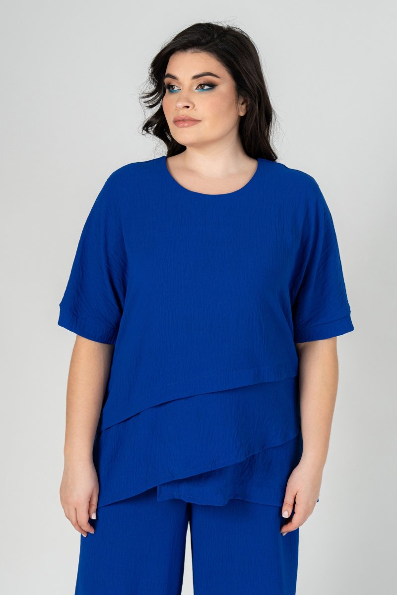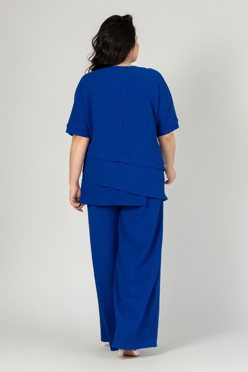 Костюм складається з туніки та штанів. Виконаний із тканини – американський креп. Тканина злегка стисла, не мнеться і не просвічується, має зернисту, шорстку структуру, розтяжність низька. Туніка прямого силуету з асиметричними підрізами. Рукав - цільнокроєний на манжеті. Штани прямі з високою посадкою на резинці (розтяжність 5-7 см).