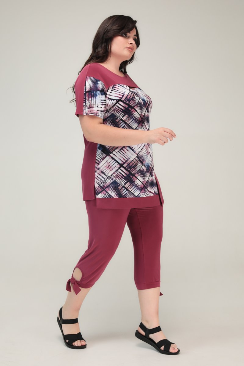 Костюм двопредметний, капрі та футболка, виконаний з якісного матеріалу - трикотаж масло (Південна Корея). Тканина має гладку текстуру, міцна, зносостійка, еластична, красиво облягає фігуру і має відмінну повітряно-пропускну здатність. Не деформується після прання та не піддається утворенню катишок. Капрі прямого силуету, внизу на манжеті із зав'язками. Футболка прямого силуету, рукав цільнокроєний. Полиця асиметрична, знизу по діагональному шву виконаний розріз. По центру полички, у шві, виконано горизонтальну краплю. Низ виробу асиметричний, у правому бічному шві - розріз.