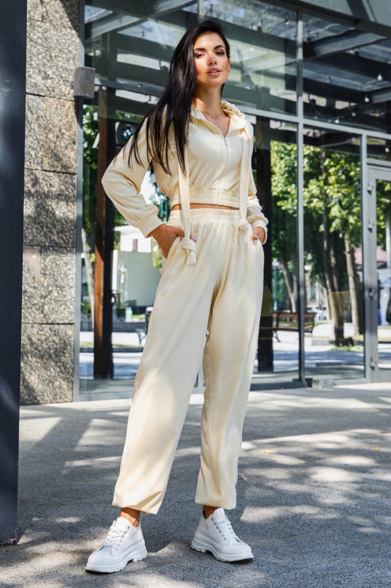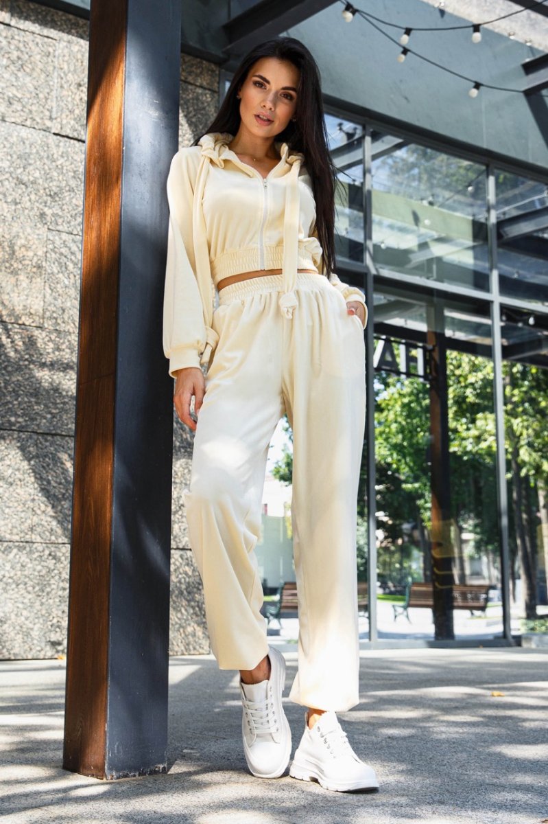 Модний жіночий костюм з велюру у стилі спорт-шик. Наш новий прогулянковий костюм – двійка – чудовий вибір на теплу осінь! Головним критерієм для повсякденного одягу залишається комфорт. У нашій новій моделі Ви почуватиметеся зручно та комфортно, адже це так важливо у сучасному ритмі життя. Модель костюма поєднує у собі світшот з довгими рукавами з капюшоном та комфортні штани.