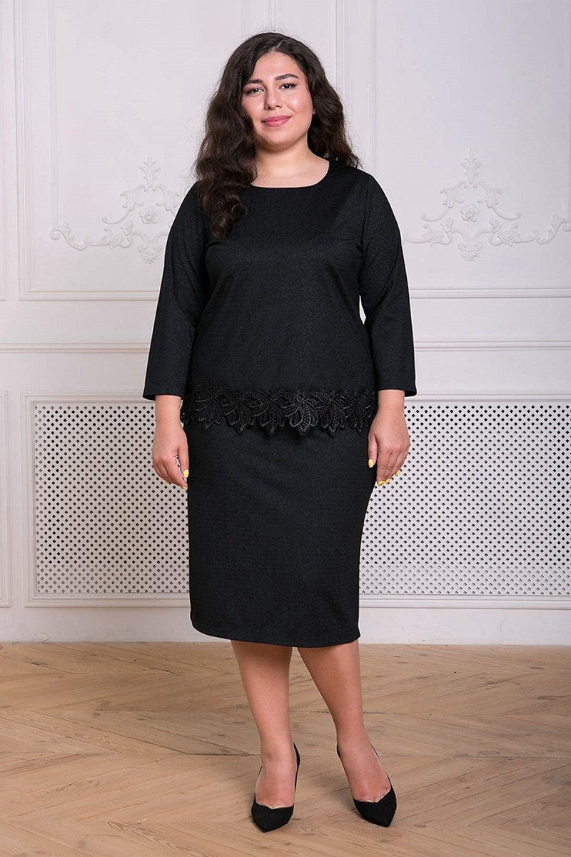 Костюм для повсякденного та святкового носіння з декоративним оздобленням низу блузи. Костюм складається зі спідниці-олівець на резинці (ширина гумки 4-5 см) та простого по крою блуза з круглим вирізом. По низу переду блузи широке об'ємне мереживо.