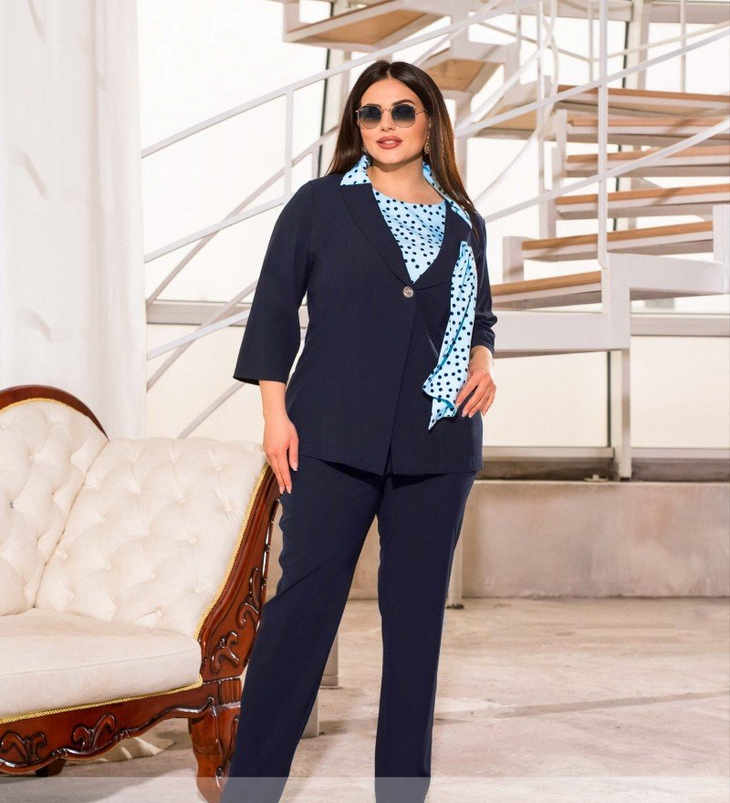 Широкий виріз V-форми підкреслює красу відкритої шиї, а широкі рукави довжини 7/8 додають елегантності цьому образу. Крім того, у комплекті є чарівна блуза в горошок з короткими рукавами, яка гармонійно поєднується з шарфиком на піджаку, зверніть увагу, що розмір принту може змінюватись в залежності від партії. А завершенням цього чудового комплекту є класичні брюки в тон піджака з гумкою на талії та бічними кишенями.