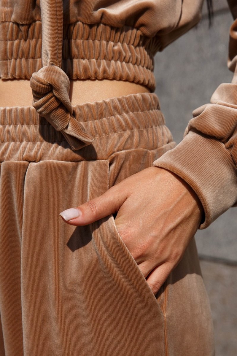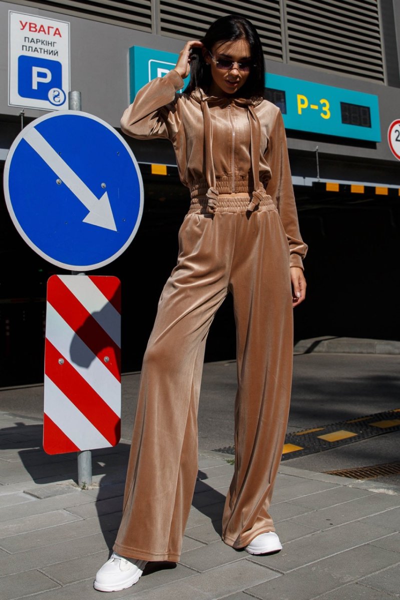 Модний жіночий костюм з велюру у стилі спорт-шик. Наш новий прогулянковий костюм – двійка – чудовий вибір на теплу осінь! Головним критерієм для повсякденного одягу залишається комфорт. У нашій новій моделі Ви почуватиметеся зручно та комфортно, адже це так важливо у сучасному ритмі життя. Модель костюма поєднує у собі світшот з довгими рукавами з капюшоном та штани – кюлоти вільного крою.