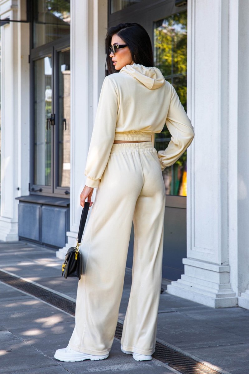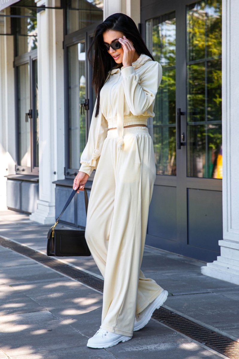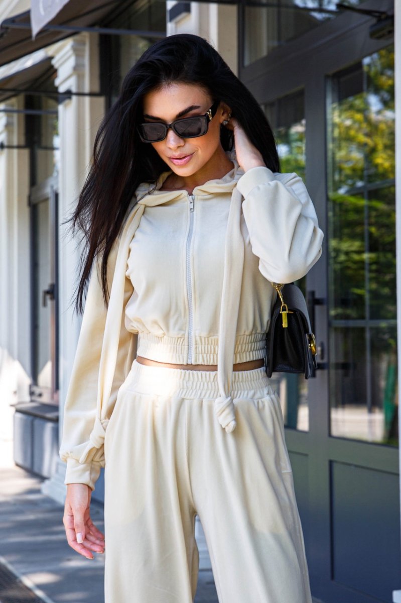 Модний жіночий костюм з велюру у стилі спорт-шик. Наш новий прогулянковий костюм – двійка – чудовий вибір на теплу осінь! Головним критерієм для повсякденного одягу залишається комфорт. У нашій новій моделі Ви почуватиметеся зручно та комфортно, адже це так важливо у сучасному ритмі життя. Модель костюма поєднує у собі світшот з довгими рукавами з капюшоном та штани – кюлоти вільного крою.