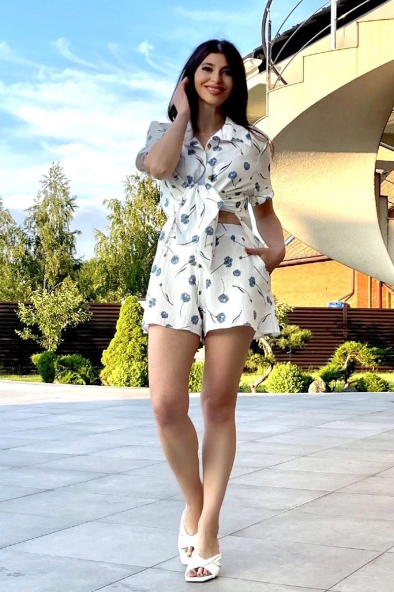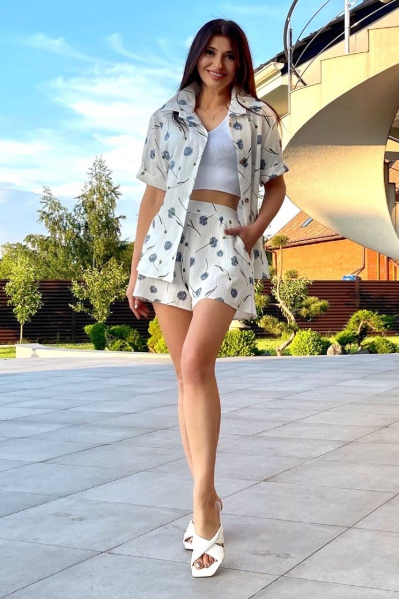 Наша новинка - це універсальне рішення як для походу на пляж, так і для звичайної прогулянки літнього вечора, він представлений у вигляді блузи і шортиків. Блуза прямого крою з центральною планкою на ґудзиках та коротким рукавом з манжетою. Короткі шортики трапецеподібної форми з з легким кльошем, які дозволять продемонструвати стрункі бездоганні ніжки. Пояс на резинці (сзаду) допоможе скоригувати лінію талії і відмінно підійде для будь-якого типу фігури як для худеньких так і для дівчат з апетитними формами. Кишені на шортах до дадуть практичності у використанні. Будь цього літа легкою та досконалою!