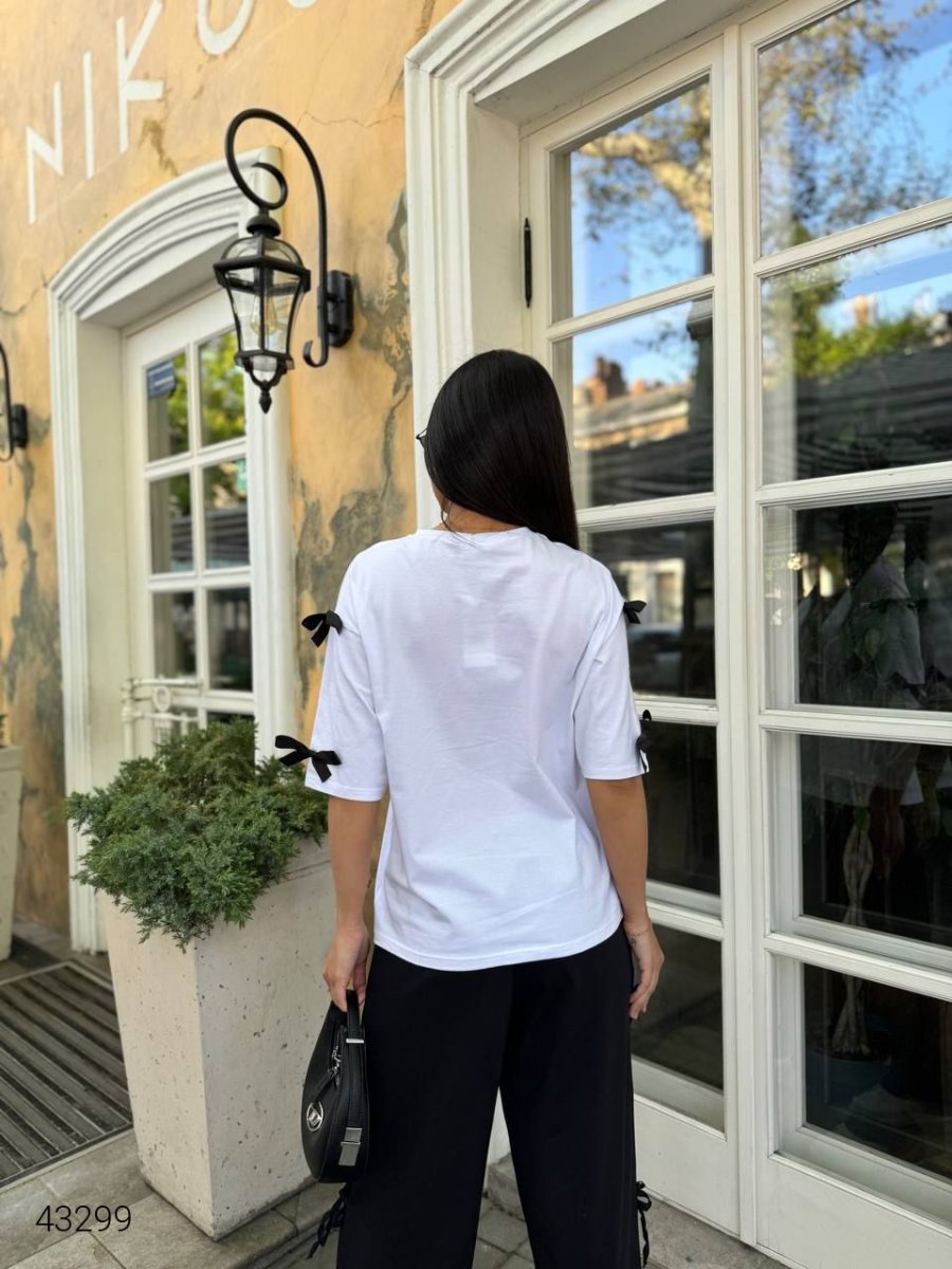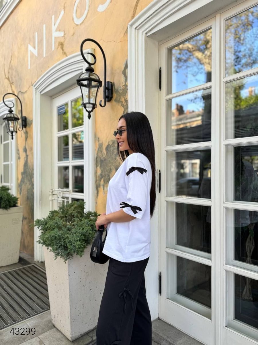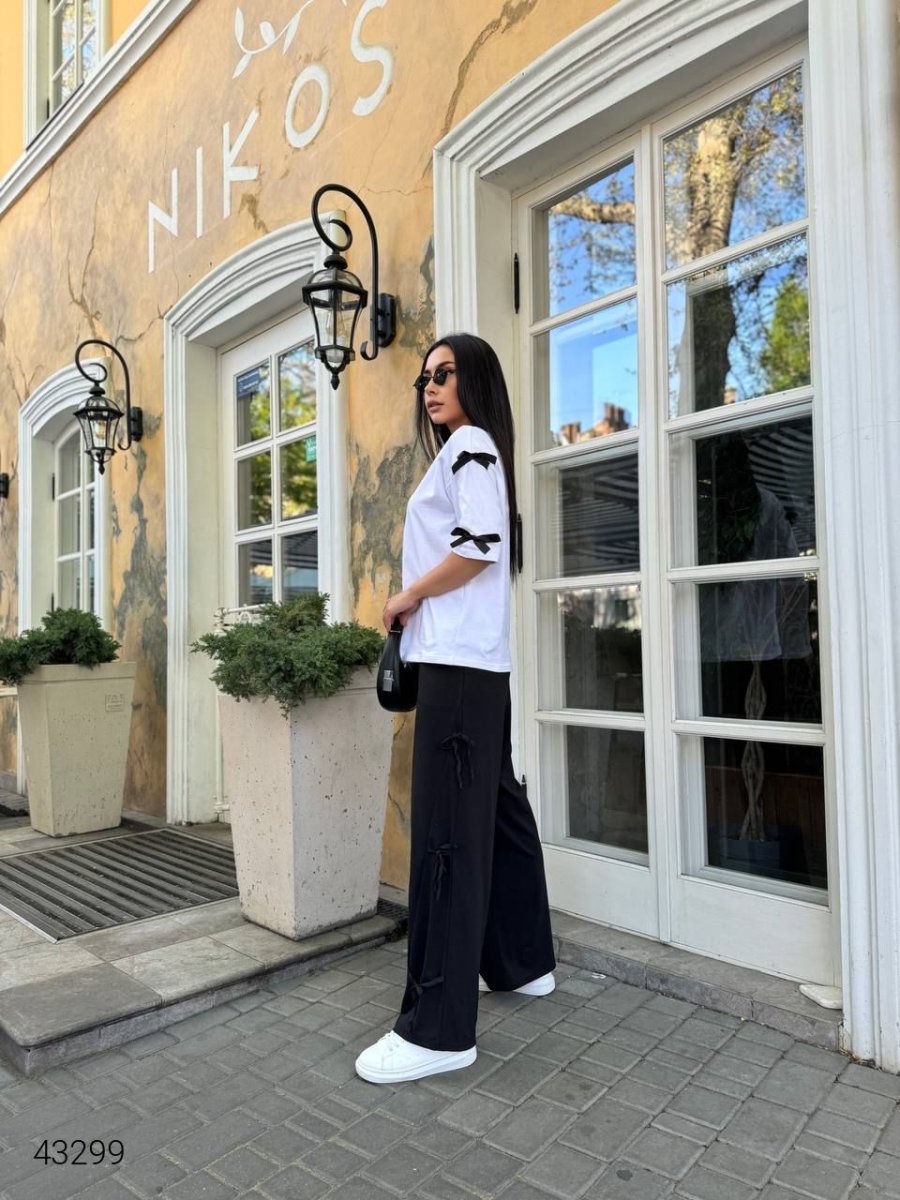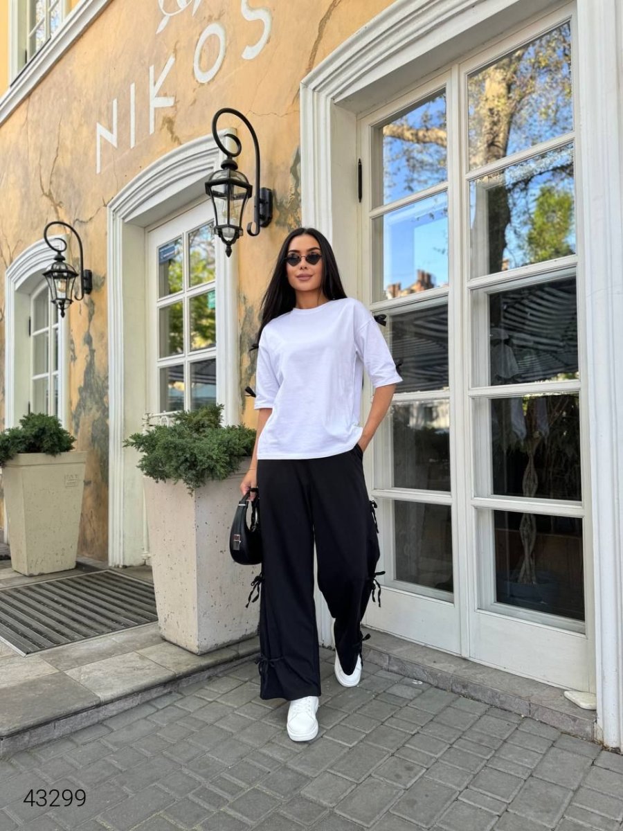 Костюм жіночий з бантиками. Модель вільного крою, ширину штанини можна коректувати бавовняними стрічками.
