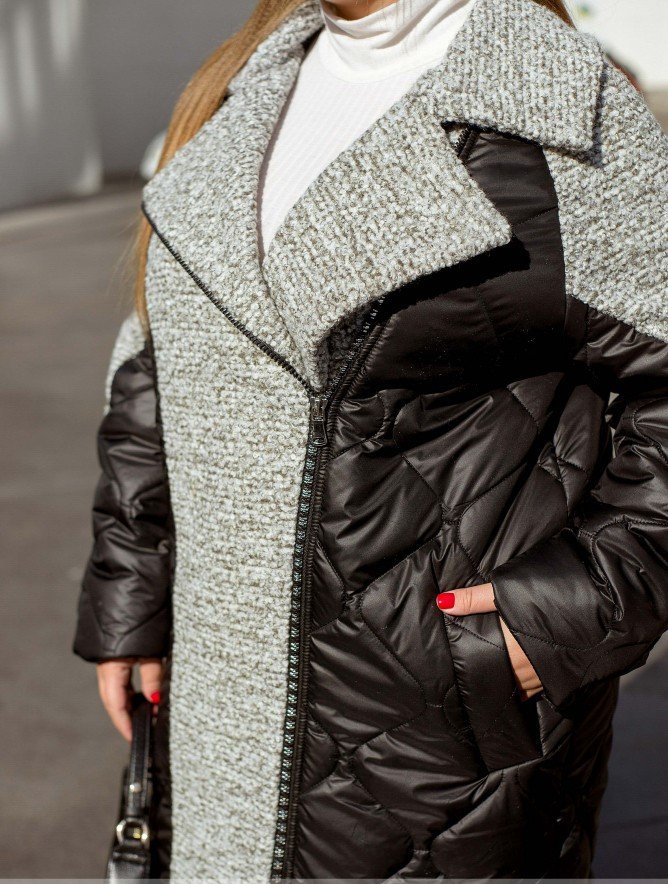 Оригінальна куртка, що комбінує в собі плащівку та вставки з тканини шерсть-баранчик, на яку ви однозначно звернете увагу. У моделі є відкладний комір, виготовлений із структурної тканини, яка переходить у вставки та комбінується на рукавах та по основній частині виробу. Цікавим елементом є блискавка, яка розташована навскіс. Також ми додали кишені на основній частині виробу.