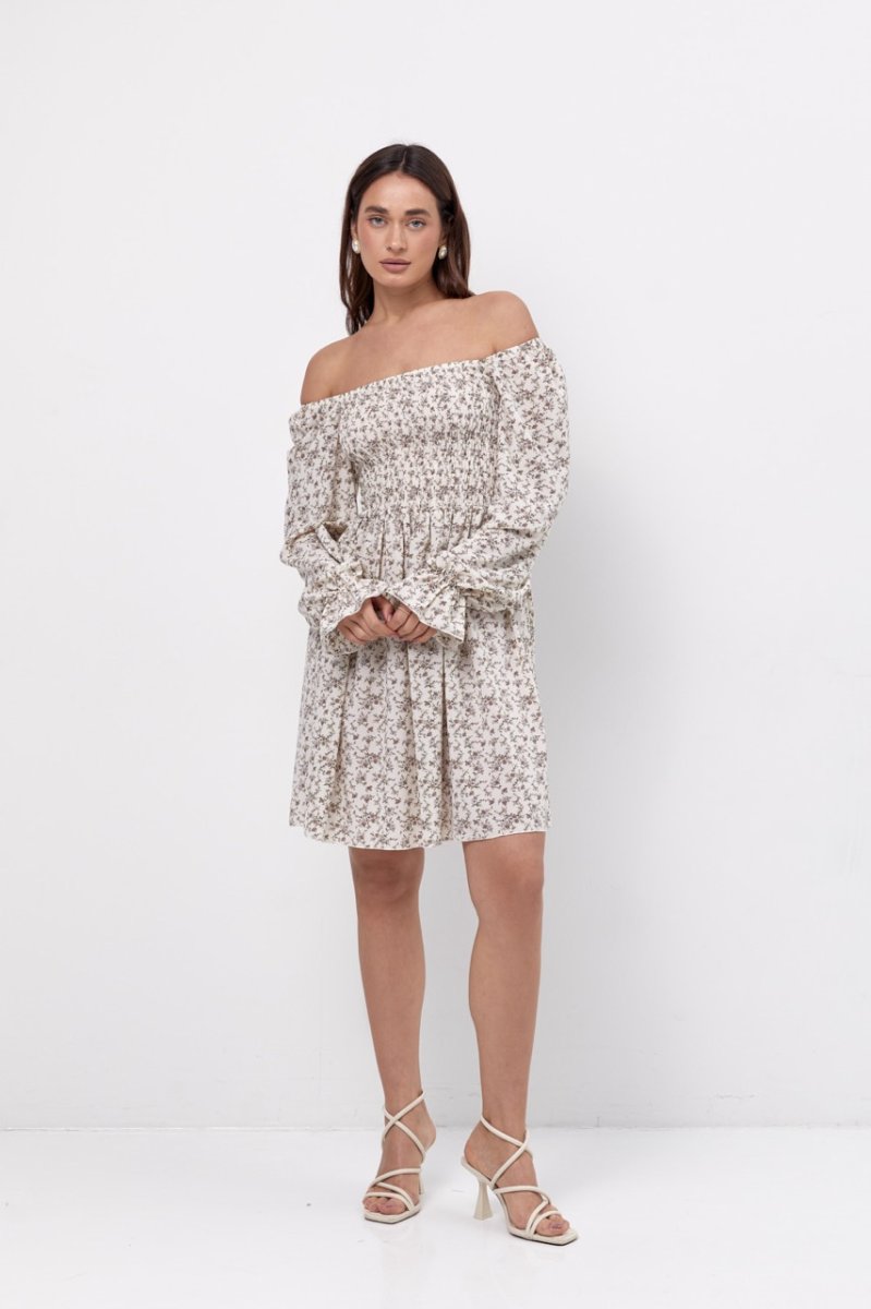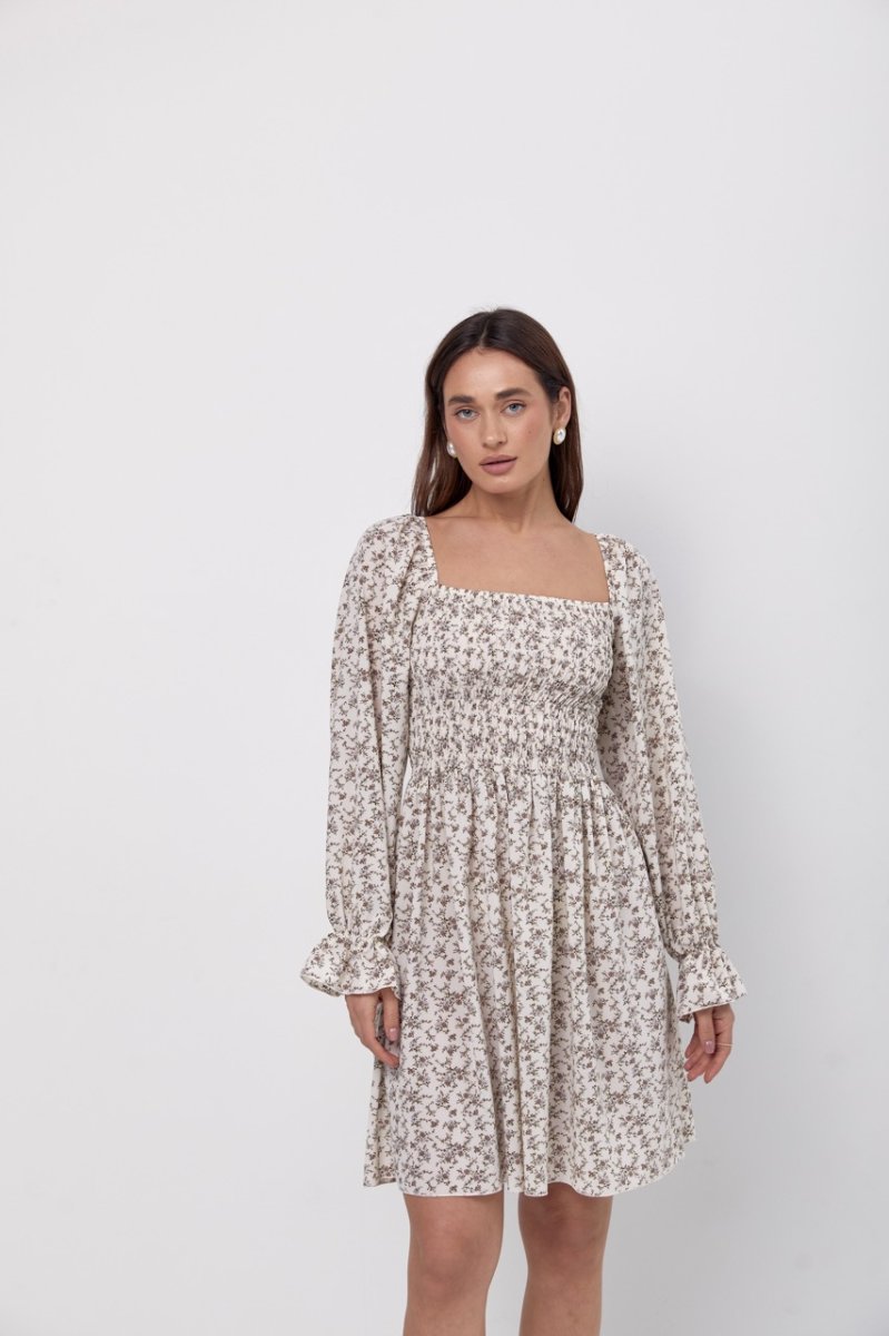 Легка сукня довжиною вище колін. Ліф зібран резинкою по всій довжині і ширині. Спідниця зібрана на талії. Рукава довгі, верхня частина зібрана резинкою і функціонує, як бритель. Низ рукава зібран з утворенням рюші. Резинка для волосся в комплекті