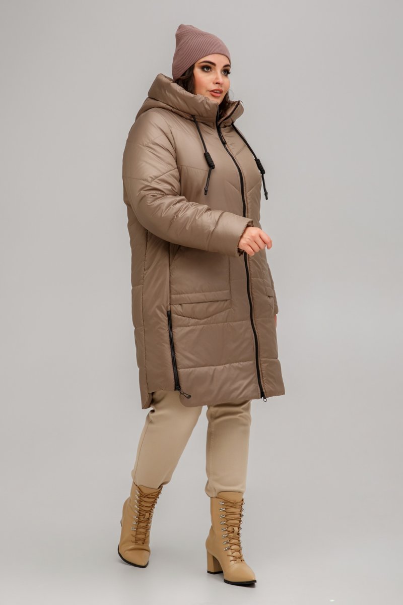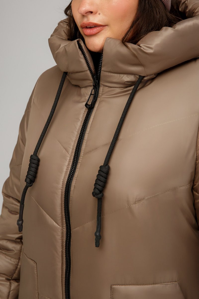 Пальто прямого силуету з плащової тканини, що застібається на двосторонню блискавку. Рукав втачний, двошовний із внутрішнім манжетом з рібани. Висота капюшону регулюється за допомогою шнурка з декоративним плетенням.