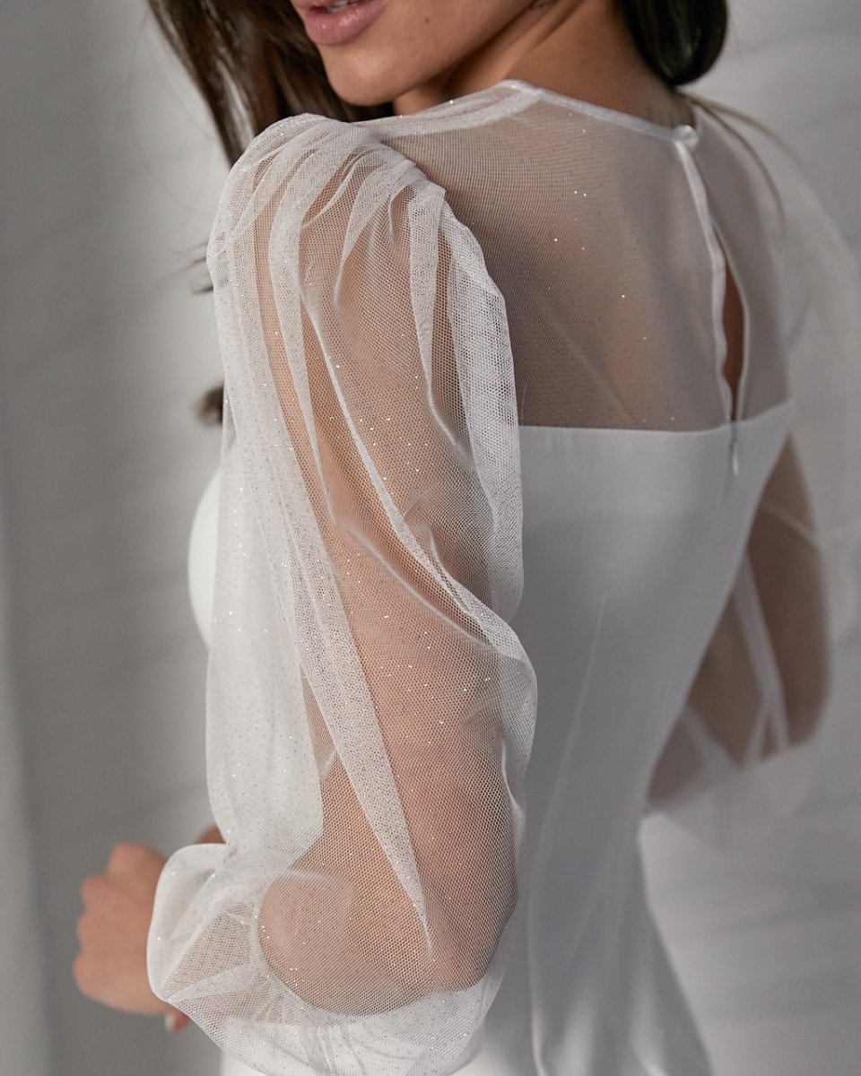 Сукня міні, рукава прозора сітка, розріз на лівій нозі. Виріб відшито з 2 тканин: трикотаж Алекс і сітка з блискучим напиленням. Рукав, кокетка пілочки і спинка виконано з сітки, а перед і спинка з трикотажу. Пілочка з вирізом у формі серця на лінії груді, є два рельєфа, по низу лівого рельєфа розріз. Спинка з талієвими виточками, в середньому шві застібка на приховану тасьму блискавку. Виріз горловини круглий. Кокетка на спинці застібається на навісну петлю та гудзик. Рукава пишні по окату, по низу із резинкою.