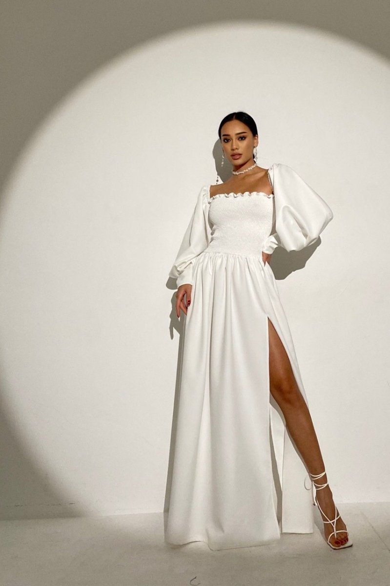 Шикарна і повітряна сукня «Ділара» додасть ніжності та жіночності у сучасний образ дівчини. Сукня Х-подібного силуету з пишним рукавом на високому манжеті. Ліф на резинці, відмінно підійде для струнких дівчат так і власниць пишних форм. По переду передбачено високий розріз. Рукав – пришивний на резинці. Пишна спідниця додасть Вашому образу романтичності. До жіночного образу сміливо додавайте взуття на підборах, компактні сумочки та елегантну біжутерію.