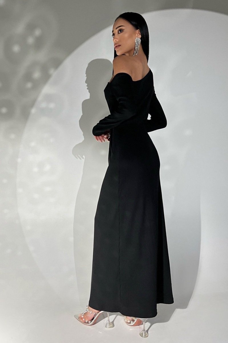 Неймовірне, спокусливе, стильне, зухвало модне - все це про нашу нову сукню! Чорна сукня-міді виконана з трикотажного матеріалу, який чудово сідає по фігурі. Модель стилізована асиметричним вирізом з боку. Сукня представлена з відкритим плечем, що додає образу жіночності та вишуканості. Чудовий образ для виходу на вечір! Сукня оздоблена ланцюжком з камінчиками.