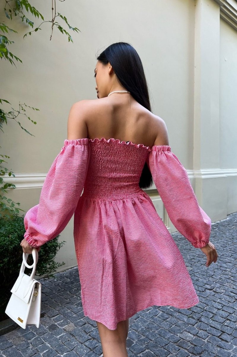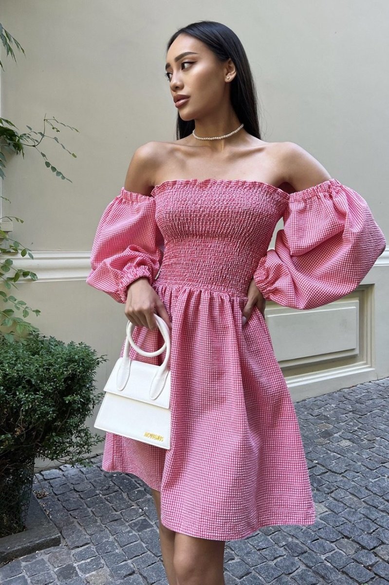 Міні-сукня із завищеною талією, еластичним ліфом і відкритою лінією плечей, буде особливо актуально в жаркі дні. Легка однотонна модель з рукавами-ліхтариками, зшита з дихаючого тонкого матеріалу виконано в яскравій палітрі літніх кольорів.