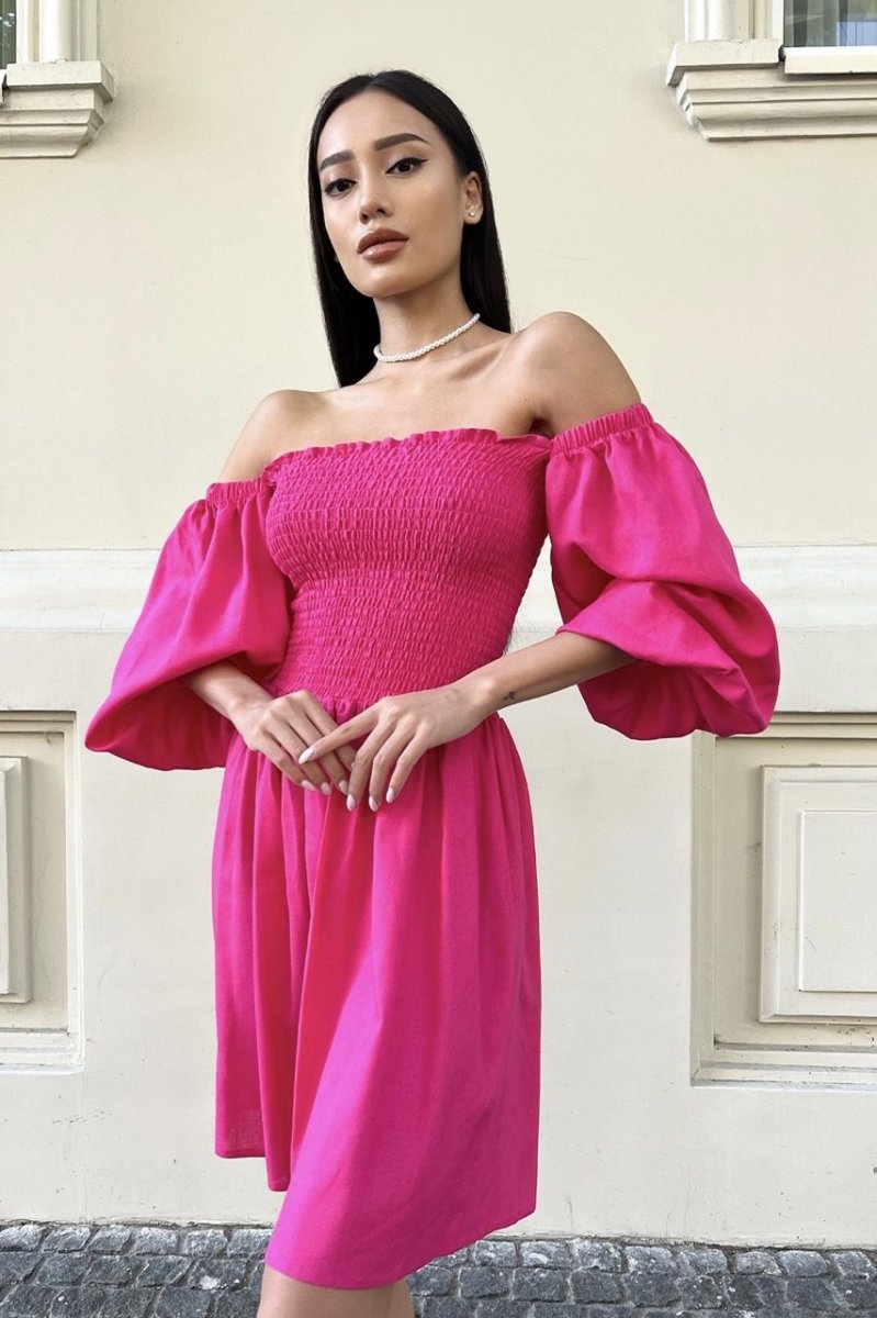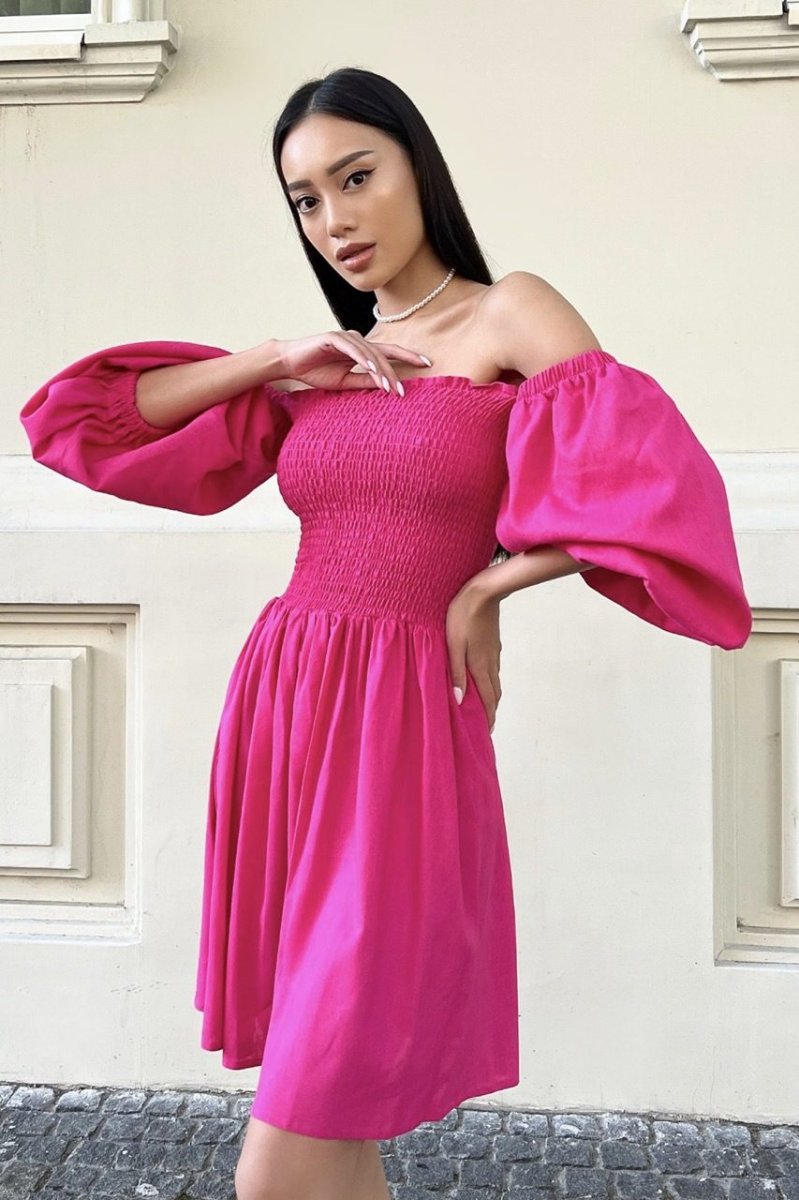 Оригінальна літня міні- сукня з льону. Відкриті плечі та ефектний довгий рукав-ліхтарик. Шикарну розкльошену юбку, доповнює еластичний ліф. Міні-сукня із завищеною талією, еластичним ліфом і відкритою лінією плечей, буде особливо актуально в жаркі дні.