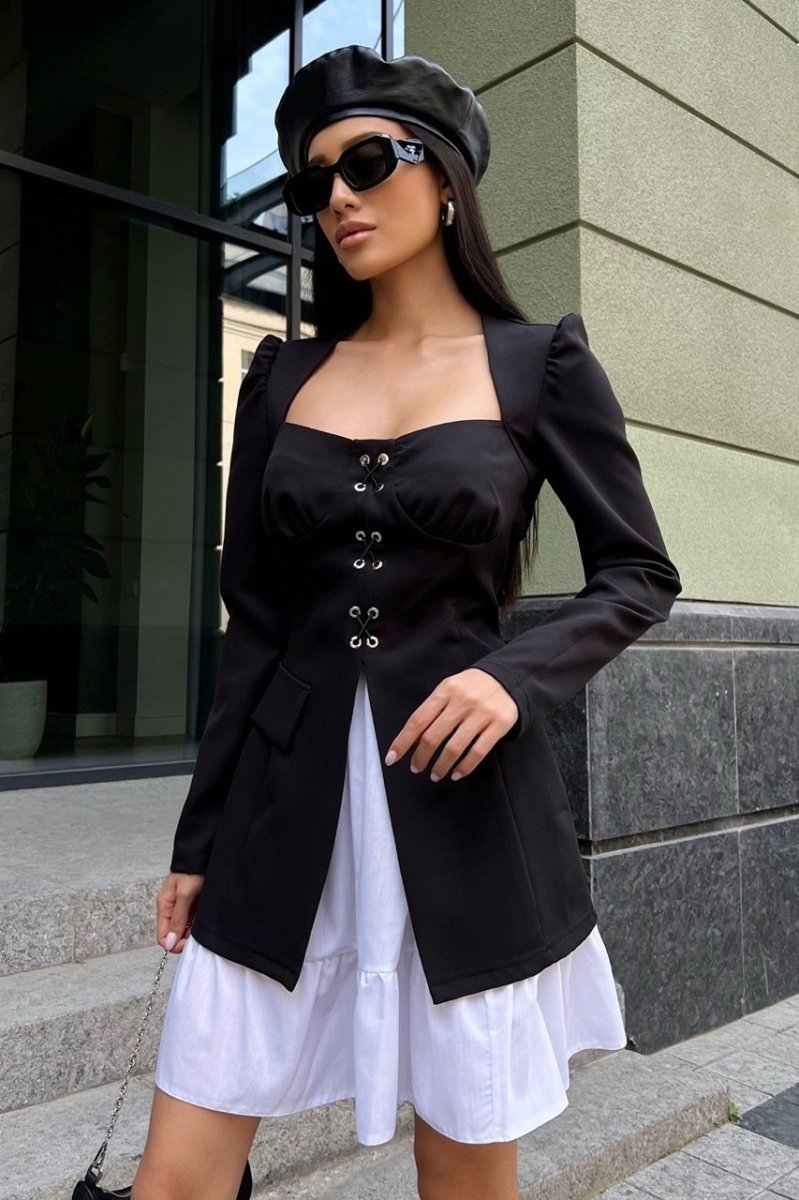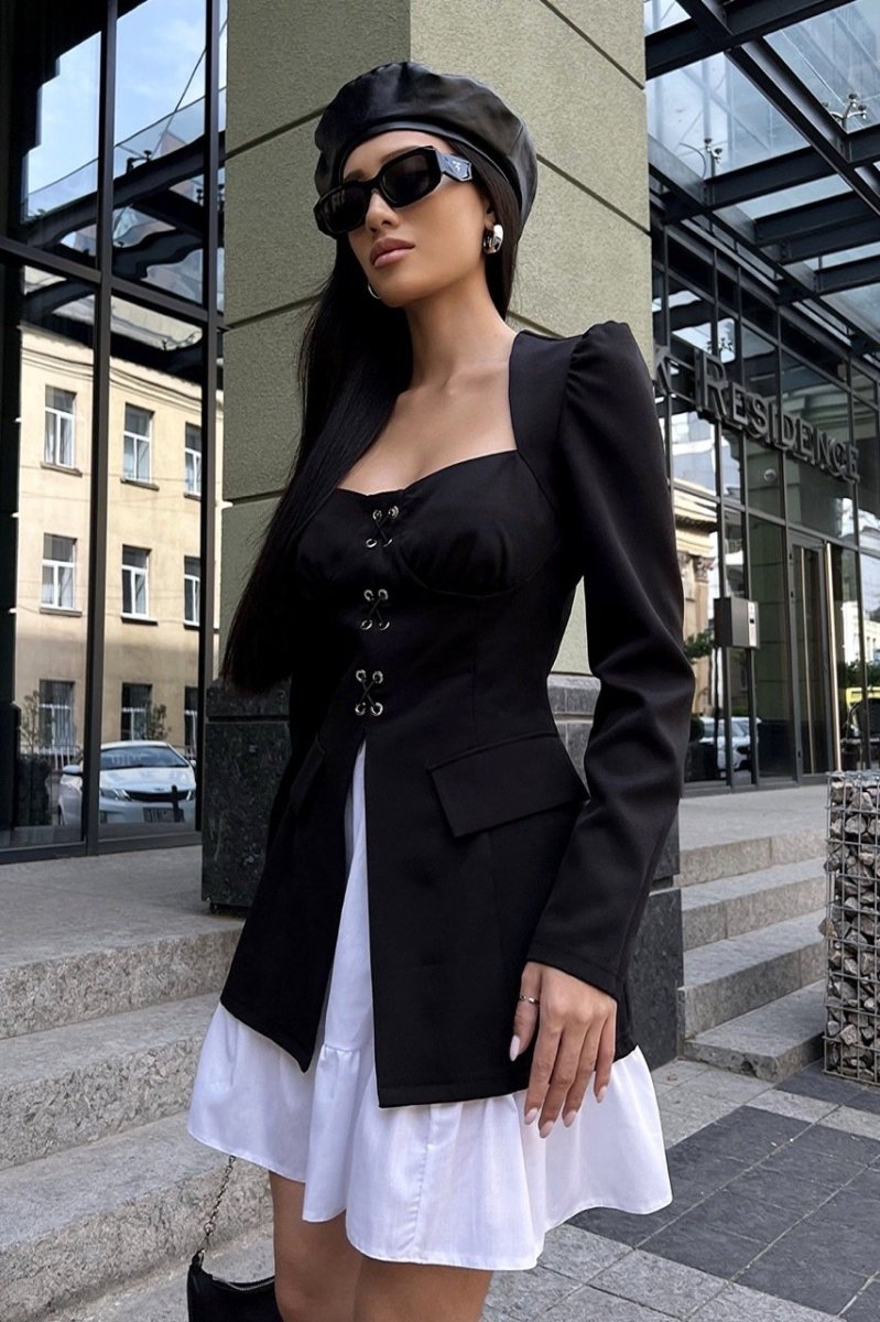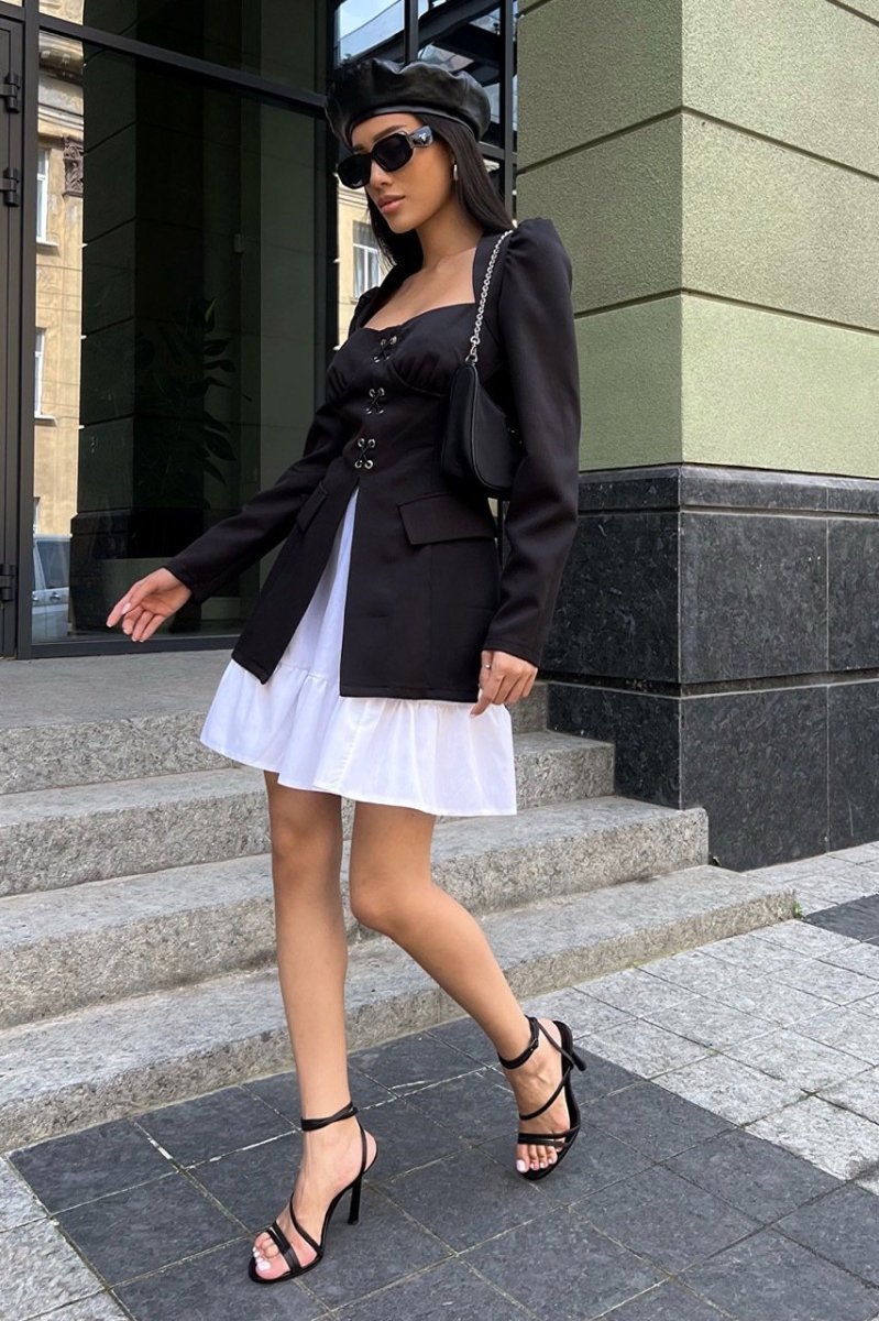 Смілива та сексуальна сукня-двійка стане справжнім втіленням грайливості та кокетства. Сукня прилеглого силуету з фігурним квадратним вирізом дозволить продемонструвати красиву лінію декольте. Довжина міні, зона декольте формується завдяки формованій чашці та шнуровці попереду. До сукні передбачена окрема спідниця - під'юбник. Плаття представлено у цікавій комбінації чорного з білим - стане чудовою прикрасою свята чи сукнею на кожен день.