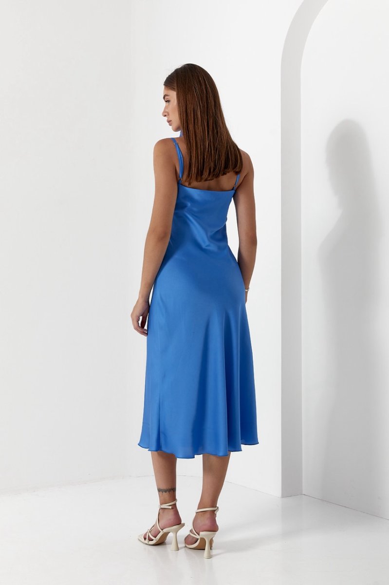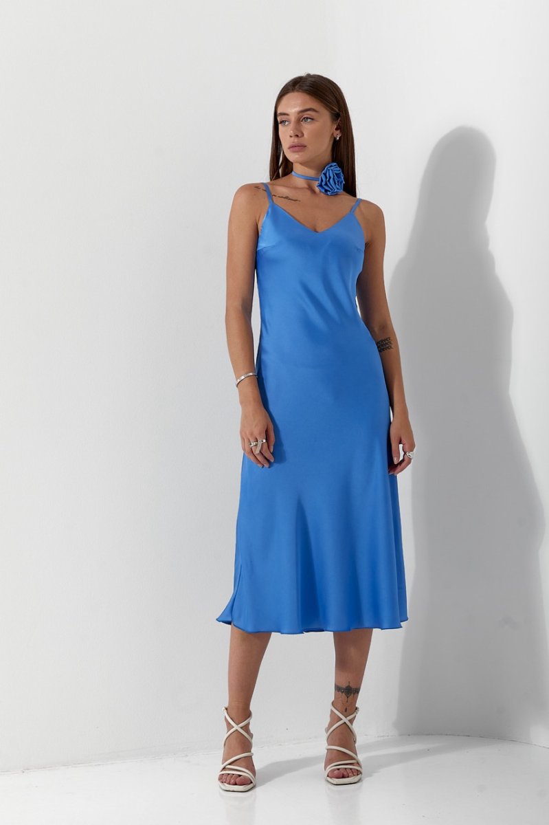 Сукня комбінація в білізняному стилі, міді, чорного кольору, на тонких брителях, які регулюються. Виріб викроений по косині тканини, що створює ідеальне прилегання по фігурі. До низу плаття розширене.