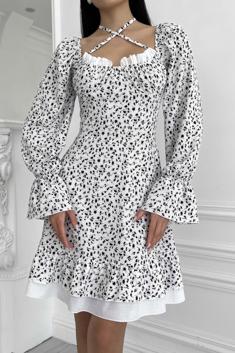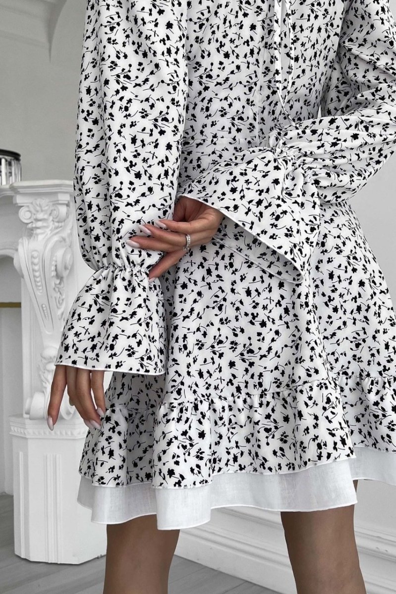 Ніжна сукня з легкої тканини у весняно-літній принт, оздоблена грайливими воланами по спідниці та ліфу. Модель представлена у широкій кольоровій гамі, довжина міні. Сукня приталеного крою з довгими рукавами з еластичними вставками. Легкий софт надає образу грайливість та романтичність. Квітковий принт залишається актуальним поза сезоном. Застібається на блискавку по спинці.