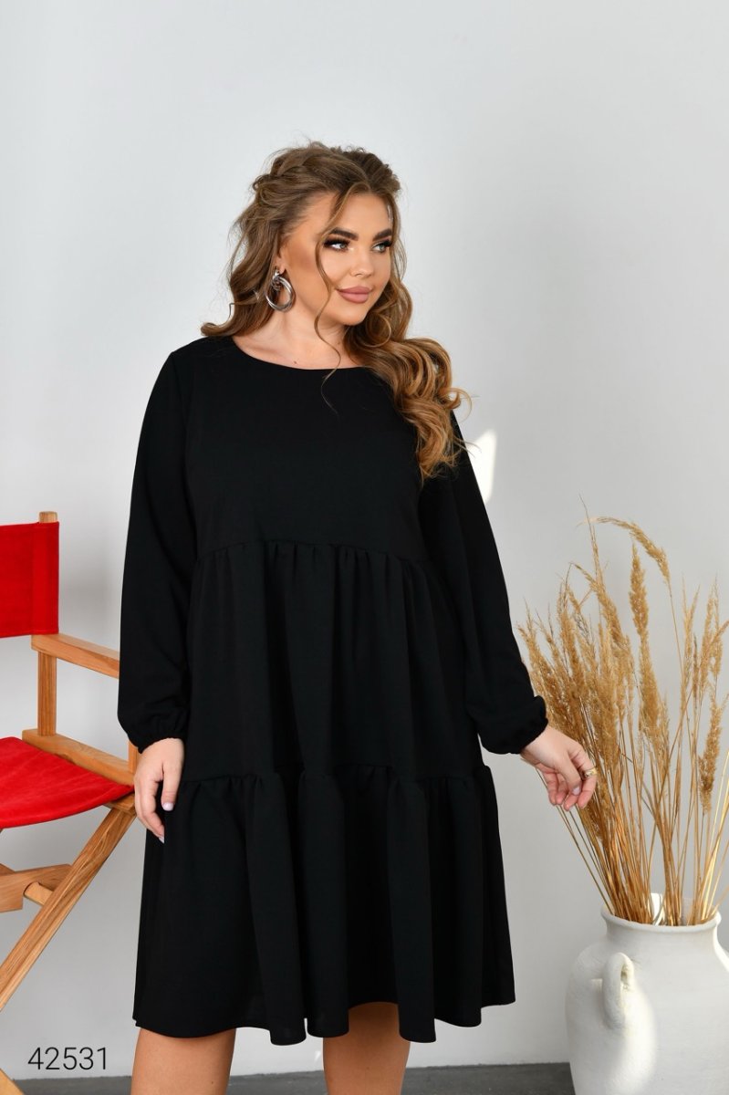 Сукня вільного крою. Спідниця виконана із двох ярусів. Виріз горловини круглий, довгий рукав на гумці.