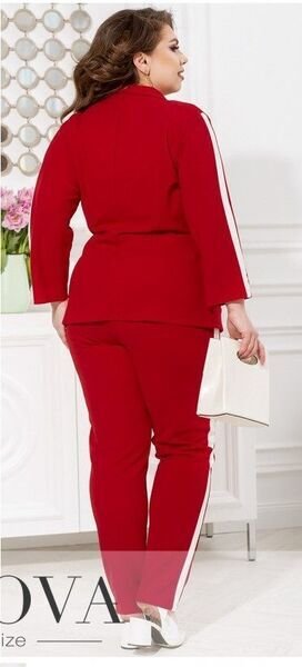 Мінімалістичний привабливий костюм з жакетом та брюками допоможе створити дійсно стильний та яскравий образ. Жакет без підкладки, доповнений відкладним коміром із лацканами, зав'язується на підшитий збоку поясок. Класичні штани з лампасами та карманами застібаються на змійку та ґудзик спереду.