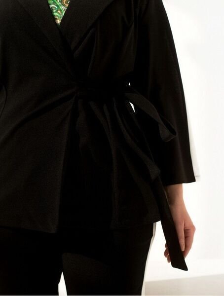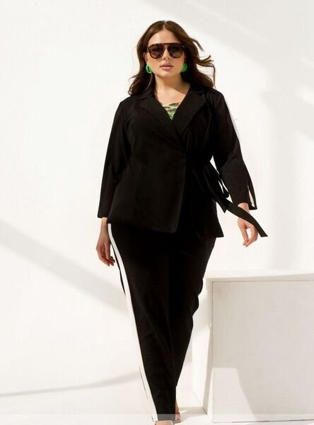 Мінімалістичний привабливий костюм з жакетом та брюками допоможе створити дійсно стильний та яскравий образ. Жакет без підкладки, доповнений відкладним коміром із лацканами, зав'язується на підшитий збоку поясок. Класичні штани з лампасами та карманами застібаються на змійку та ґудзик спереду.