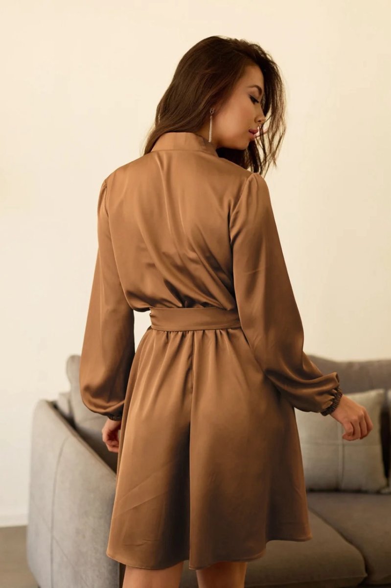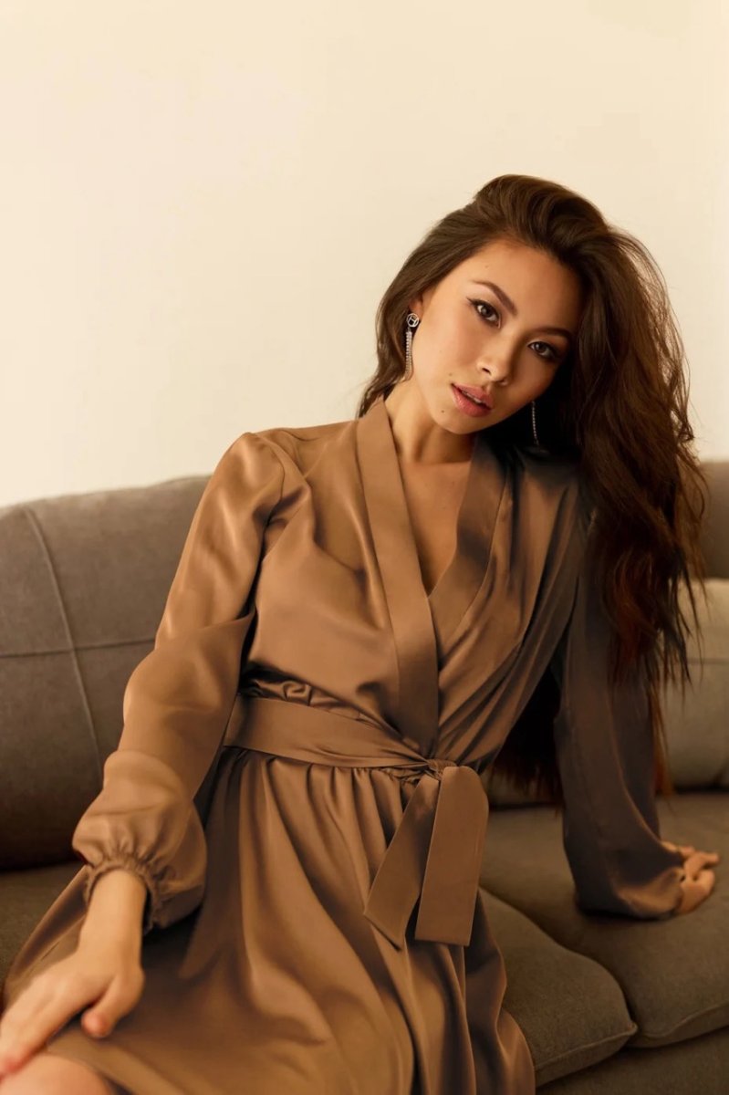 Пишна сукня вільного крою. Виріз горловини V-подібний. Рукави довгі, пишні. Сукня йде на запах. Пояс знімний. Матеріал: шовк Армані.