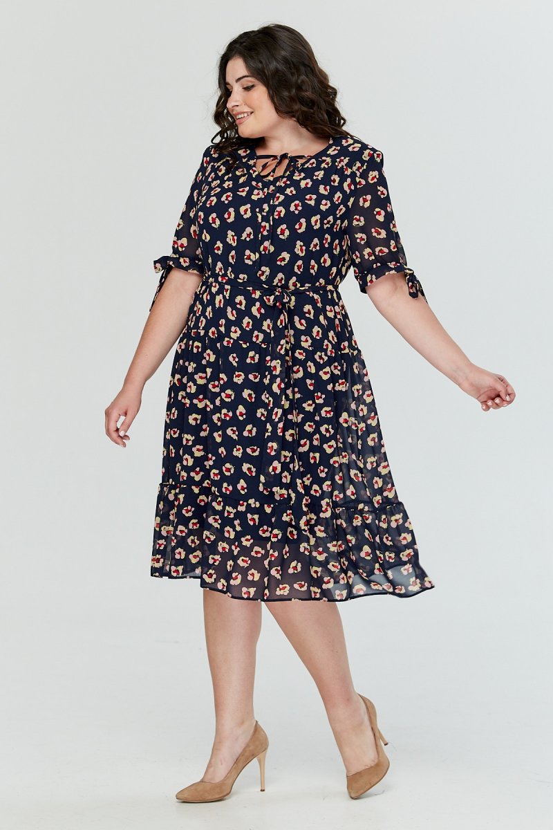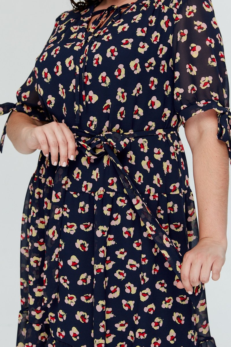 Шифонове плаття з квітковим принтом: малюнок є незаперечним літнім хітом. Розтяжність тканини низька. Для зручності передбачена непрозора трикотажна підкладка. Модель вільного силуету. За допомогою пояса, що входить в комплект, можна поставити вивірений акцент на талії. Легкість надає не тільки фактура тканини, але і зборка по лінії стегон в два яруси. Рукав короткий на манжеті із зав'язками. На рівні кокетки по полці - зав'язка на шнурок. Модель демократична в плані вибору прикрас і взуття.