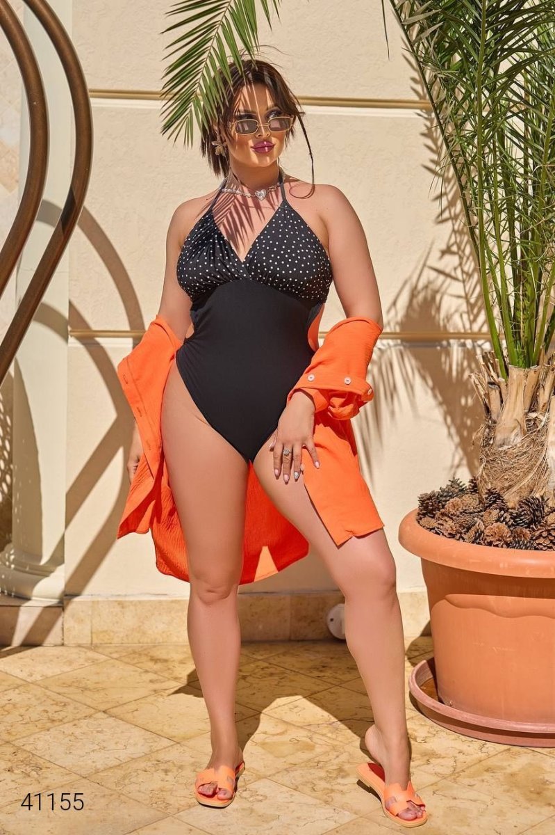 Цільний купальник великих розмірів. Верх з лямкою через шию, ззаду на зав'язках, знімна чашка 2-3 р. є підкладка. Низ із високою талією, крій з закритими сідницями. Тканина: біфлекс.