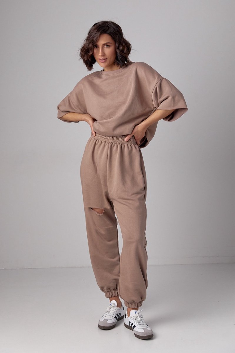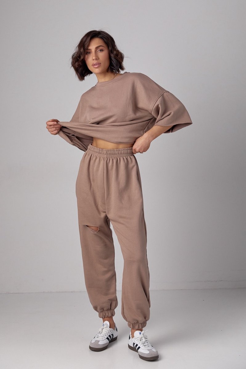 Ідеальним тандемом для світшота є джогери, які мають резинку внизу штанин та в поясі. Прорізні кишені повністю функціональні. На правій штанині є розріз. Цей спокусливий акцент робить образ загадковим і незвичайним.