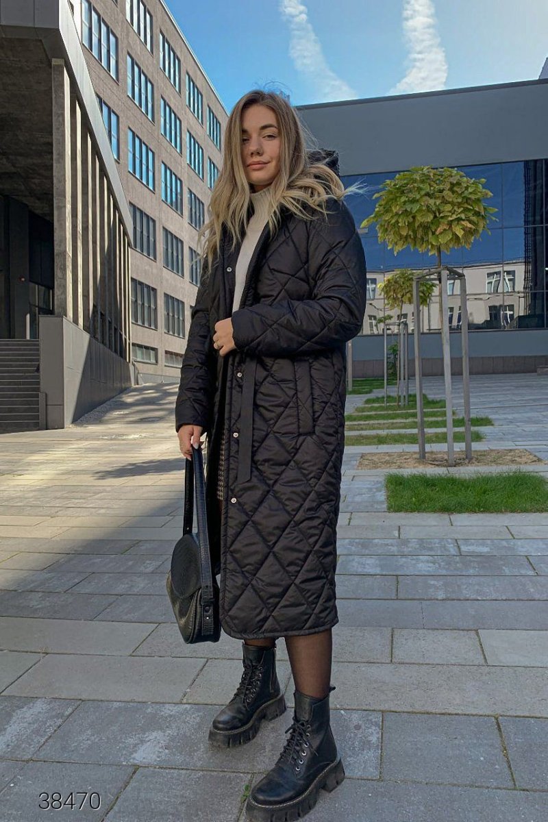 Пальто з капюшоном. Пальто із стьобаної плащової тканини на силіконі. Об'ємний капюшон, бічні прорізні кишені, шнурок, що затягується на талії. Є підкладка, планка на кнопках.