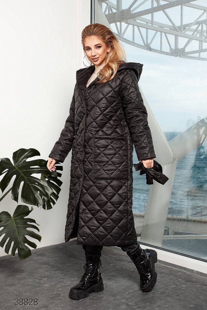 Стьобане пальто міді з капюшоном. Глибокий капюшон, бічні кишені накладні. Є принтована підкладка, що застібається на кнопки, пояс у комплекті. Тканина: плащівка стьобана на синтепоні 200 г.м2 з підкладкою.