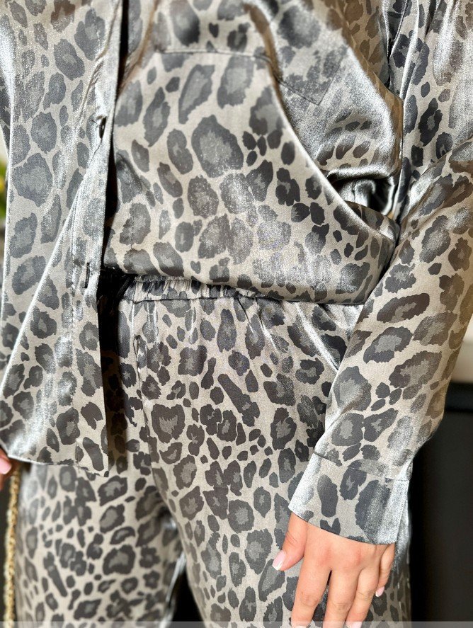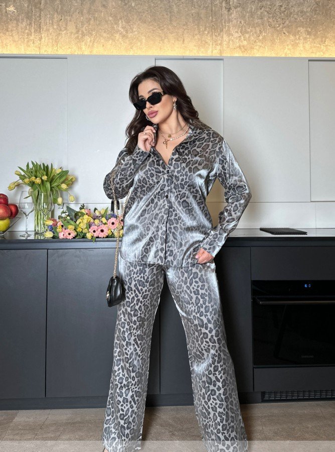 Цей стильний костюм у леопардовому принті обов'язково приверне увагу та додасть вам додаткового шарму. Сорочка на гудзиках з довгими рукавами, манжетами та гудзиками додасть вашому образу класичності та стилю. Леопардовий принт робить цей образ вишуканим. Брюки палаццо з гумкою на талії та кишенями доповнюють сорочку, роблячи образ комфортним. Цей костюм чудово підходить як для офісу, так і для інших важливих подій або вечірніх виходів.