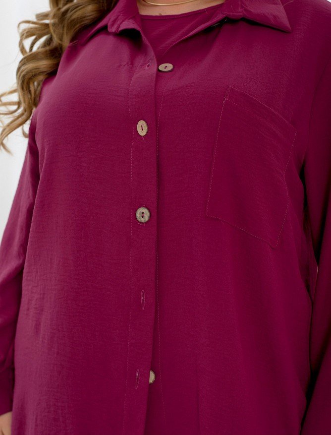 Елегантний та стильний костюм трійка великого розміру. Верхня сорочка подовжена, з відкладним комірцем, на грудях накладна кишеня, з боків - довгі розрізи. На рукавах манжети, на манжетах по одному гудзику. Брюки з високою талією, з боків - кишені в шві, до поясу вшито резинку. Майка з півкруглим вирізом горловини, на грудях виточки, з боків подолу - розрізи. Без кишень і застібок.