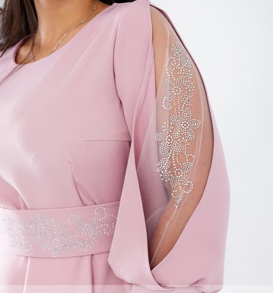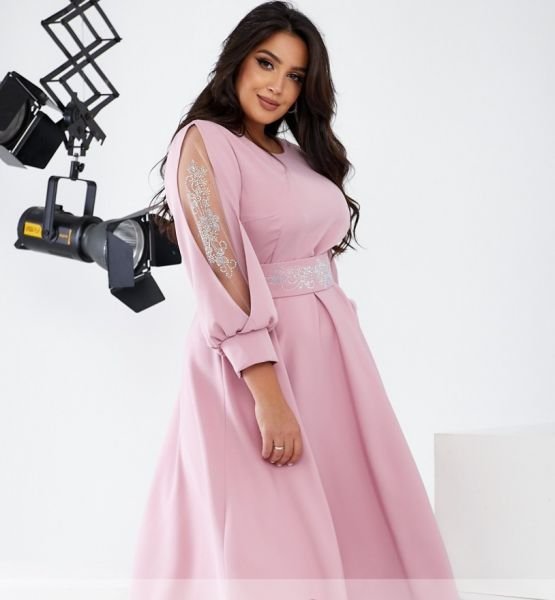 Сукня, на яку Ви однозначно звернете увагу завдяки цікавим рукавам з високим манжетом та прорізами, які доповнені ніжною сіткою, яка прикрашена стразами. Сукня має відрізну лінію талії, яку можна доповнити поясом, який застібається на кнопки та декорований з візерунком. На спинці блискавка- застібка.