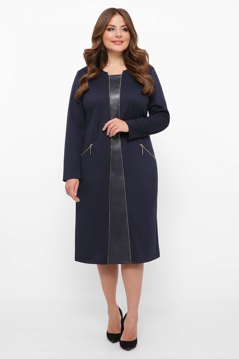 Лаконічна сукня трохи приталеного силуету з оригінальною вставкою зі штучної шкіри по переду вироба. Край вставки декоровано металевою блискавкою. По зігнутим рельєфам переду вшиті косі кишені на блискавці. Рукав втачний, трохи звужений.