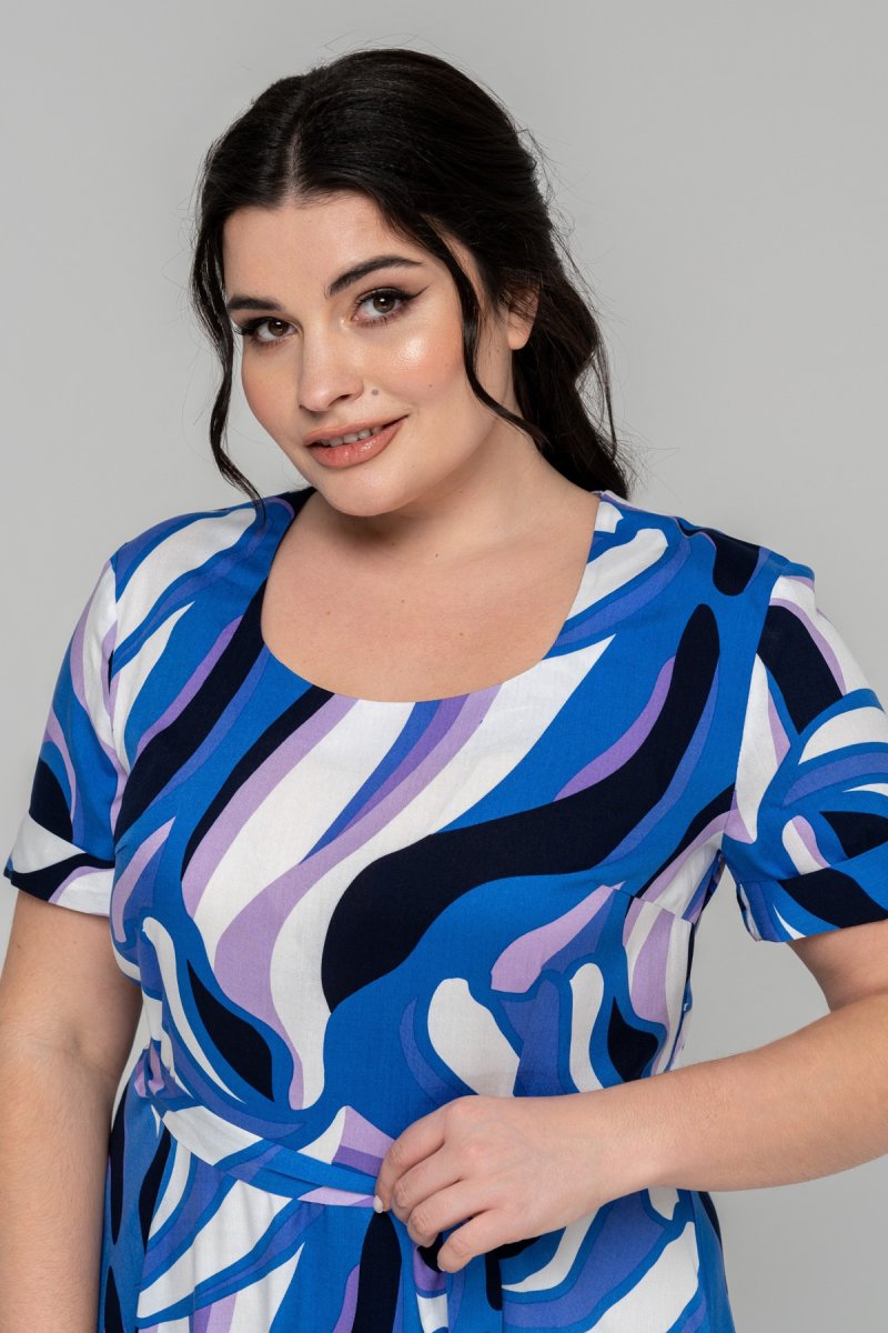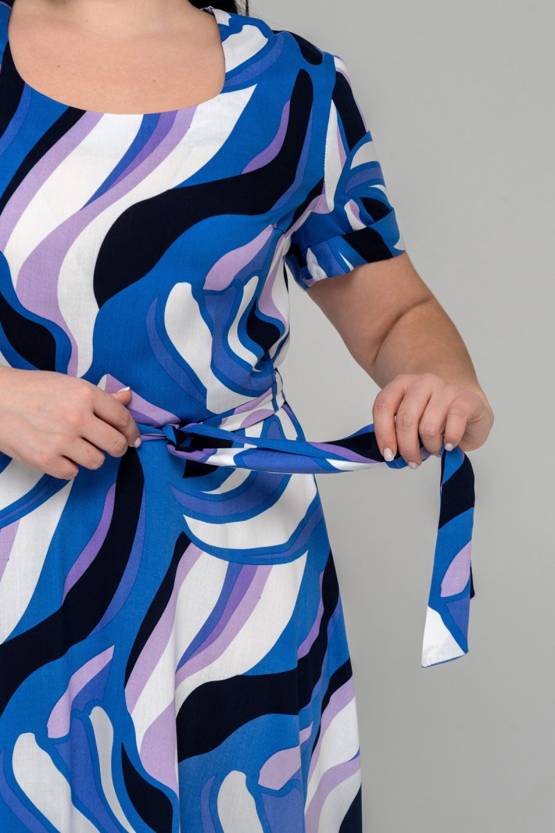 Сукня відрізна по лінії талії, спідниця сонце-кльош, верх приталений. Виконана зі штапелю, тканина легка і тактильно приємна, але також має підвищену міцність і практичність. Рукав втачний, одношовний на манжеті. У комплекті: пояс із тієї ж тканини.