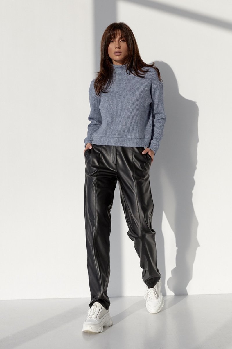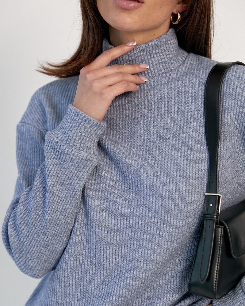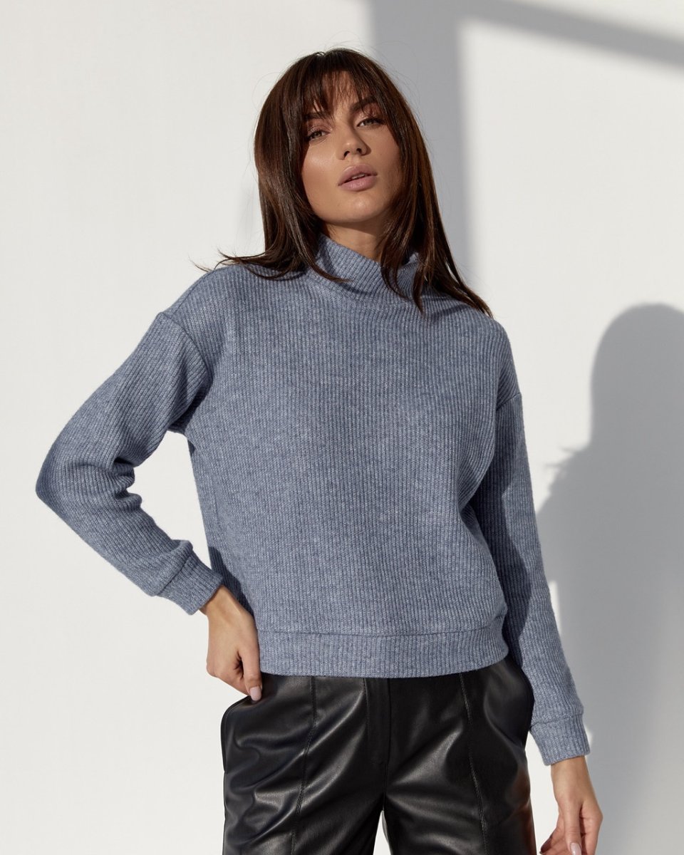 Теплий трикотажний светр із коміром - стійкою. Рівень плеча приспущений, рукава втачні, довгі, по низу рукавів і по низу виробу виконан манжет.