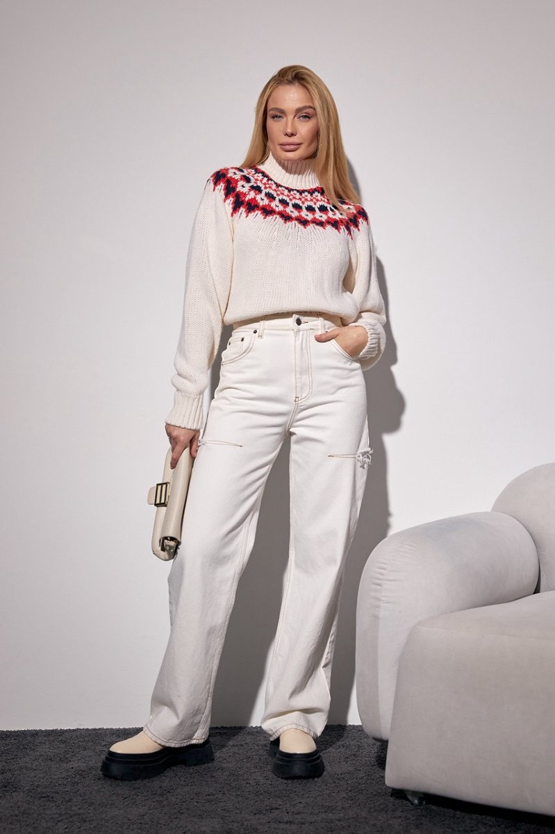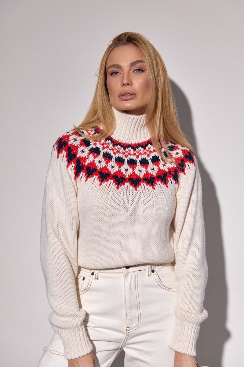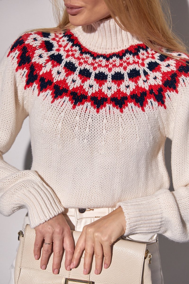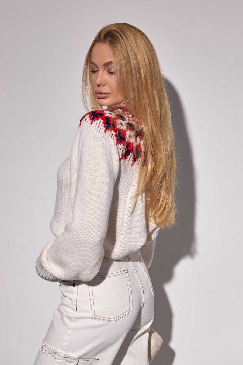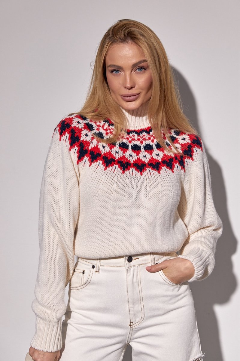 Модель виконана з м'якої теплої пряжі та вгорі спереду, а також на спинці, прикрашена трендовим орнаментом. Кругла горловина обшита коміром-стійкою, а прямий низ і довгі рукави-реглани закінчуються в'язаними манжетами.