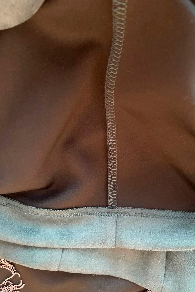 Замшеве вечірнє плаття довжини міні з акуратною стійкою на горловині. Сукня з відкритою спинкою. Застібається на гудзики ззаду. Родзинкою сукні є камені розташовані на спинці і на вирізі плеча. Замшеве вечірнє плаття-вишуканий і святковий варіант, який підкреслює жіночні обриси силуету своєї власниці.