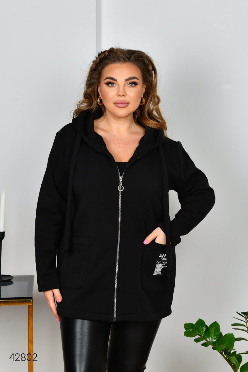 Кофта жіноча на блискавці. Кофта прямого вільного силуету, застібається на блискавку. В кулісу капюшона протягнуто обʼємний шнурок з основного матеріалу. Попереду оброблені накладні кишені. Декорована чорно-білою нашивкою.