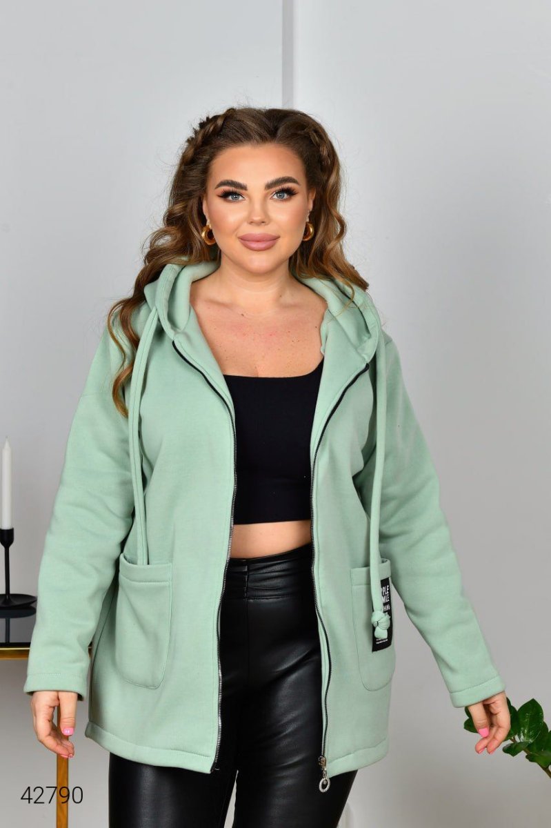 Кофта жіноча на блискавці. Кофта прямого вільного силуету, застібається на блискавку. В кулісу капюшона протягнуто обʼємний шнурок з основного матеріалу. Попереду оброблені накладні кишені. Декорована чорно-білою нашивкою.